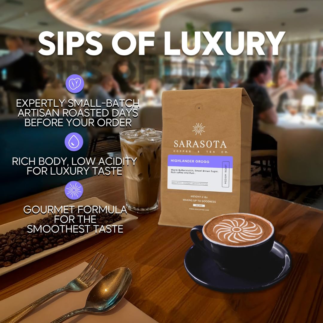 Sarasota Coffee Whole Bean Highlander Grogg | Medium Roast Gourmet Flavored Coffee Beans | Low Acid, Mold Free, Specialty Grade Flavored Bulk Beans | 5lb (80 oz)