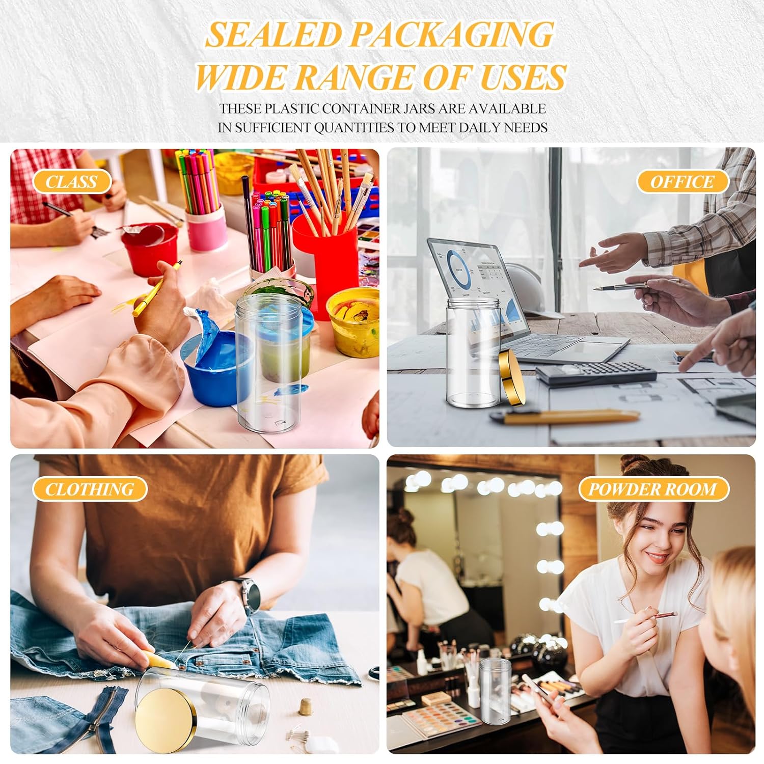 - What You Receive: there are 4 pieces plastic jars with gold screw-on lids; They are durable and refillable, measuring about 32 oz in capacity