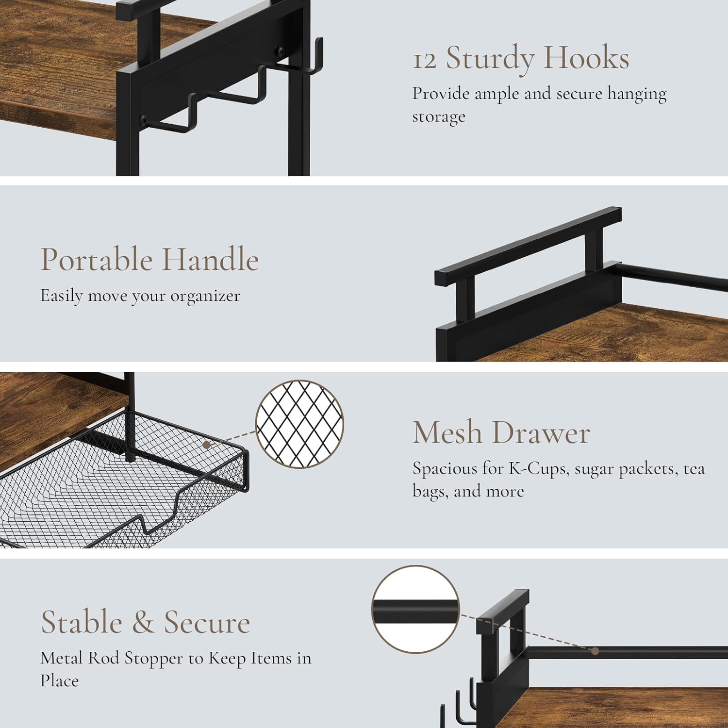 Coffee Bar Organizer, 3 Tier Coffee Station Organizer for Countertop, Mug Cup Holder Stand with 12 Hooks, with K Cup Storage Drawer, Tea Organizers Accessories for Home Office