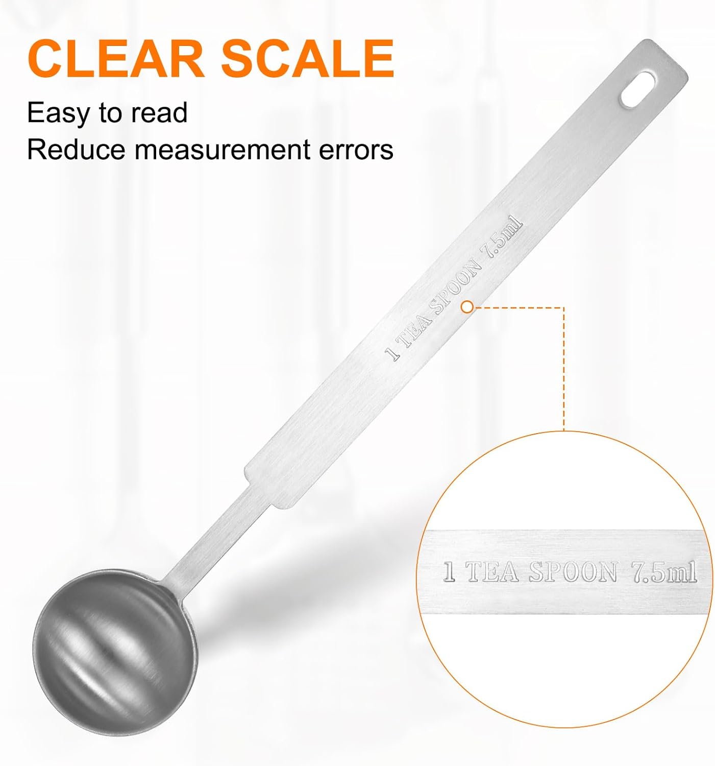 - Size - Each teaspoon is 1.5tsp | 1/2tbsp | 7.5ml, and the total size is 180 x 33mm / 7.09 x 1.3 inch (L*W). The accurate measurement size is engraved on the handle of the teaspoon, which is easy to read, can effectively reduce measurement errors, and is durable.