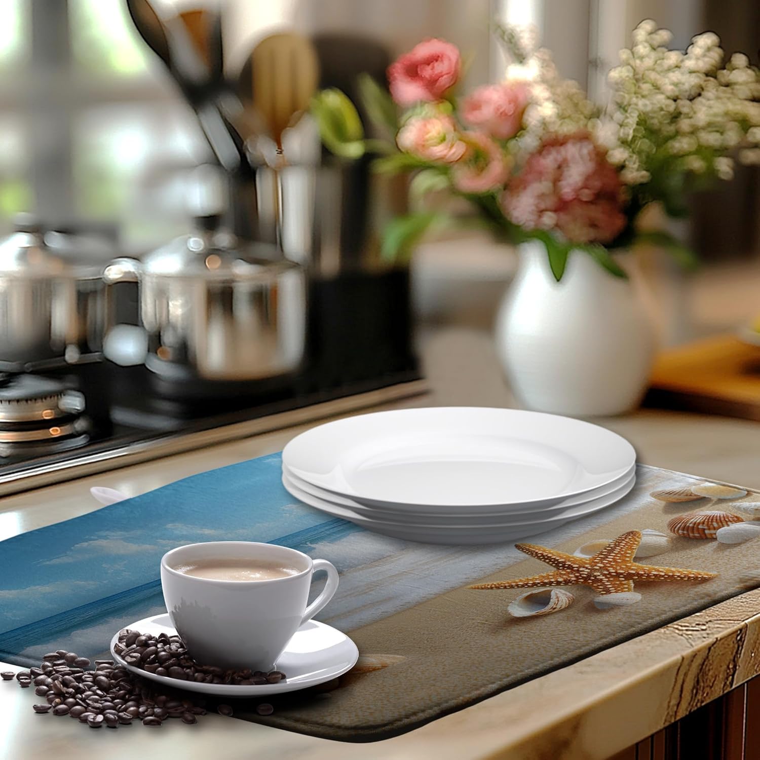 - [Multi-functional]: This Summer Blue Ocean Beach dish drying mat can be placed under the dish rack to collect dripping water to keep the counter dry and clean, or you can place bottles, pots, plates, bowls, cups and other utensils directly on the mat. Sea Shell Starfish Large dish drying mat can also be placed under the coffee machine to absorb spilled coffee.
