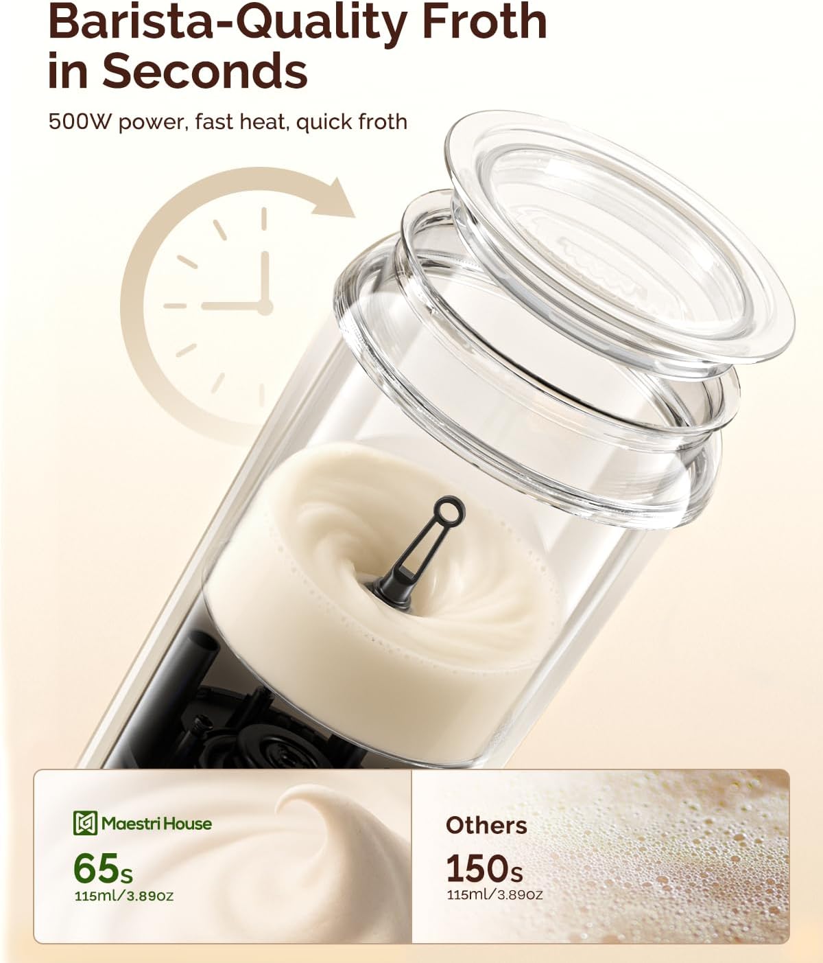 - 【Barista-Quality Froth in Seconds】Press start, and create luxuriously creamy froth in just 65 seconds (max frothing mode: 115ml/3.89oz). Watch ordinary milk transform into silky microfoam, perfect for busy mornings or impromptu coffee breaks. Ease of use meets meticulously designed coffee artistry.