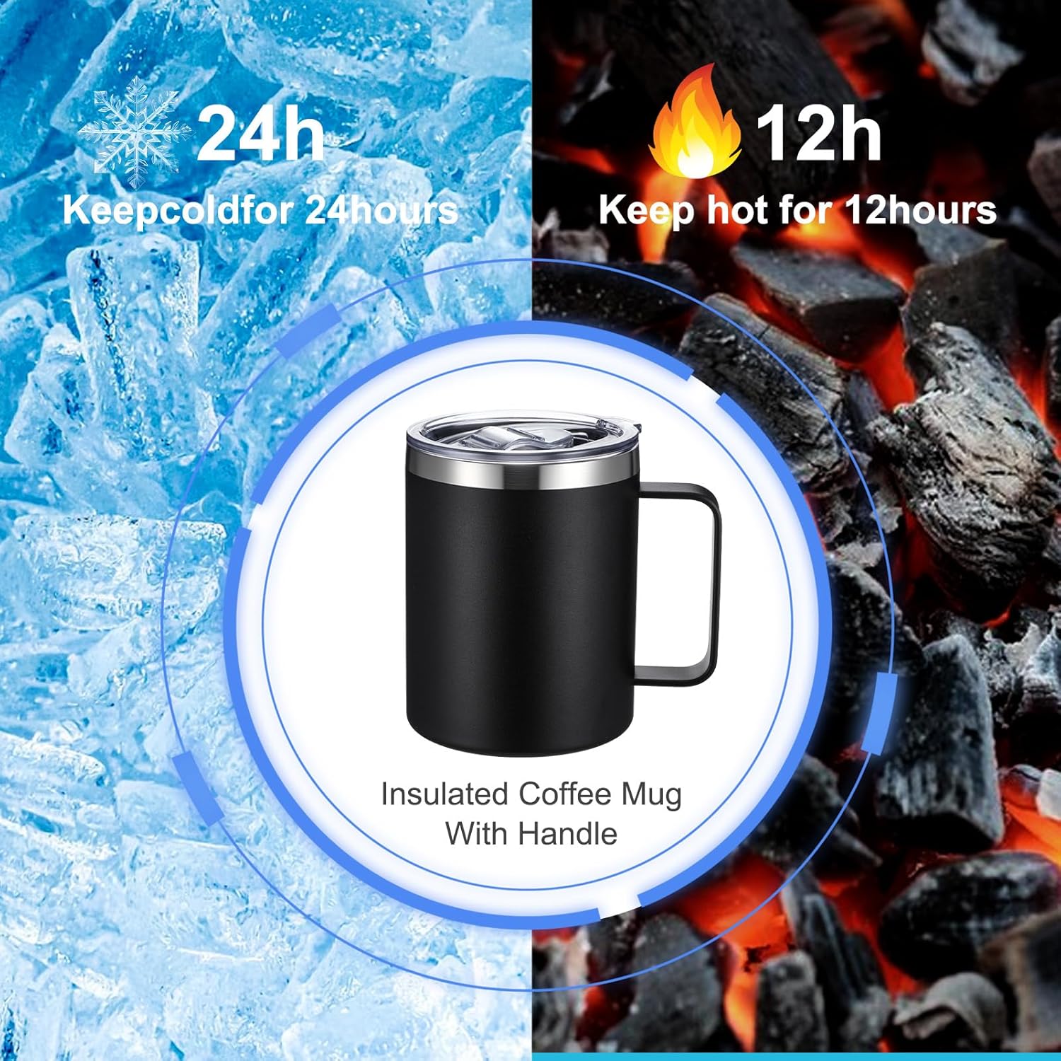 - Travel Coffee Mug with Lid: 12oz insulated Mug with lid is double walled and vacuum sealed.It keeps your favorite beverages hot for 4 hours and cold for 24 hours. You can always taste the right temperature of drink whenever you want