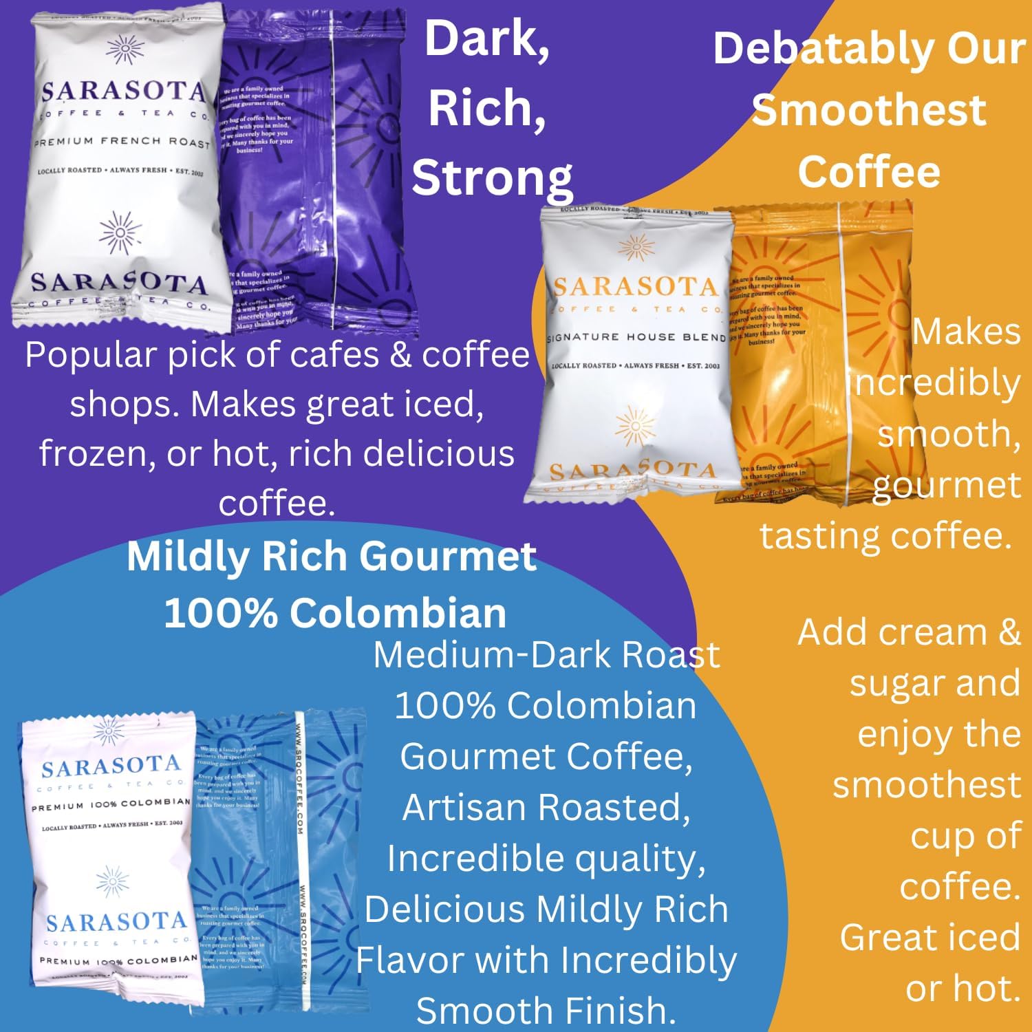 Sarasota Coffee Packs Bulk Ground Packets | Medium, Colombian, & Dark Roast Variety | Gourmet Assorted Sampler | Low Acid Mold Free Individual Pouches for 12 Cup Coffee Maker | 1.75 Oz Bags, 100 Count