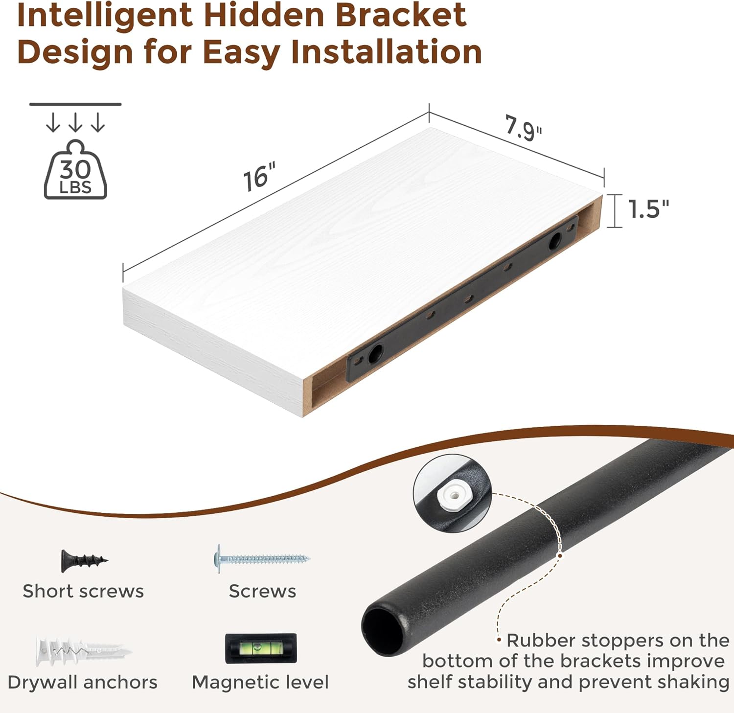 - 【Easy To Install】This white floating shelves not only come with stainless-steel galvanized invisible brackets, but also equipped a fixing screw at the bottom to fix the shelf on the support rod, which solves the problem of sliding and is not easy to damage, and can be used for a long time. Instructions, magnetic level, drywall anchors, and screws included.