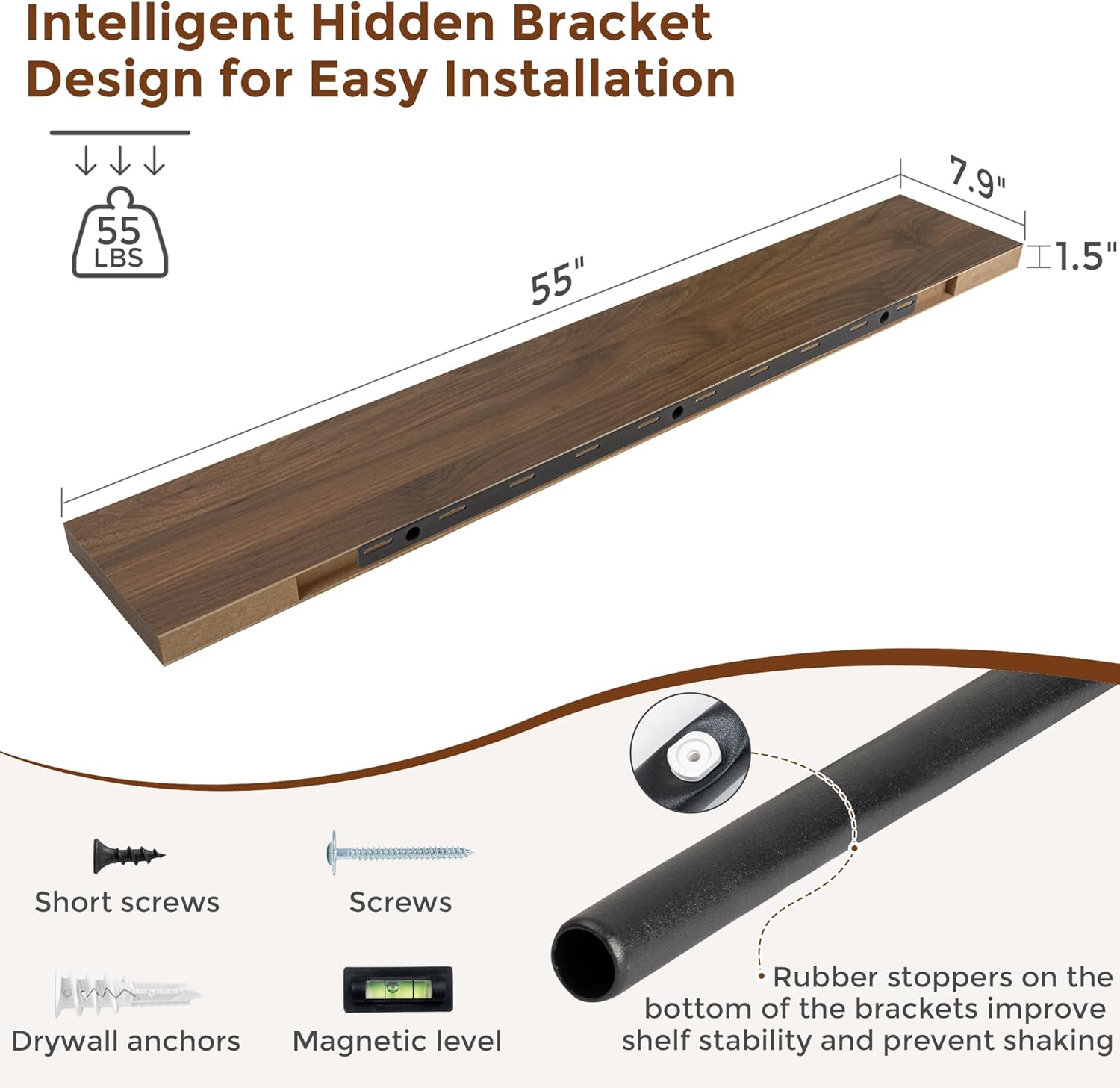 Heimlove 55 Inch Floating Shelves for Wall 8 Inch Deep Walnut Shelves Set of 2,Wall Mounted Rustic Wood Long Floating Shelf,Large Extra Display & Storage Shelf with Invisible Brackets