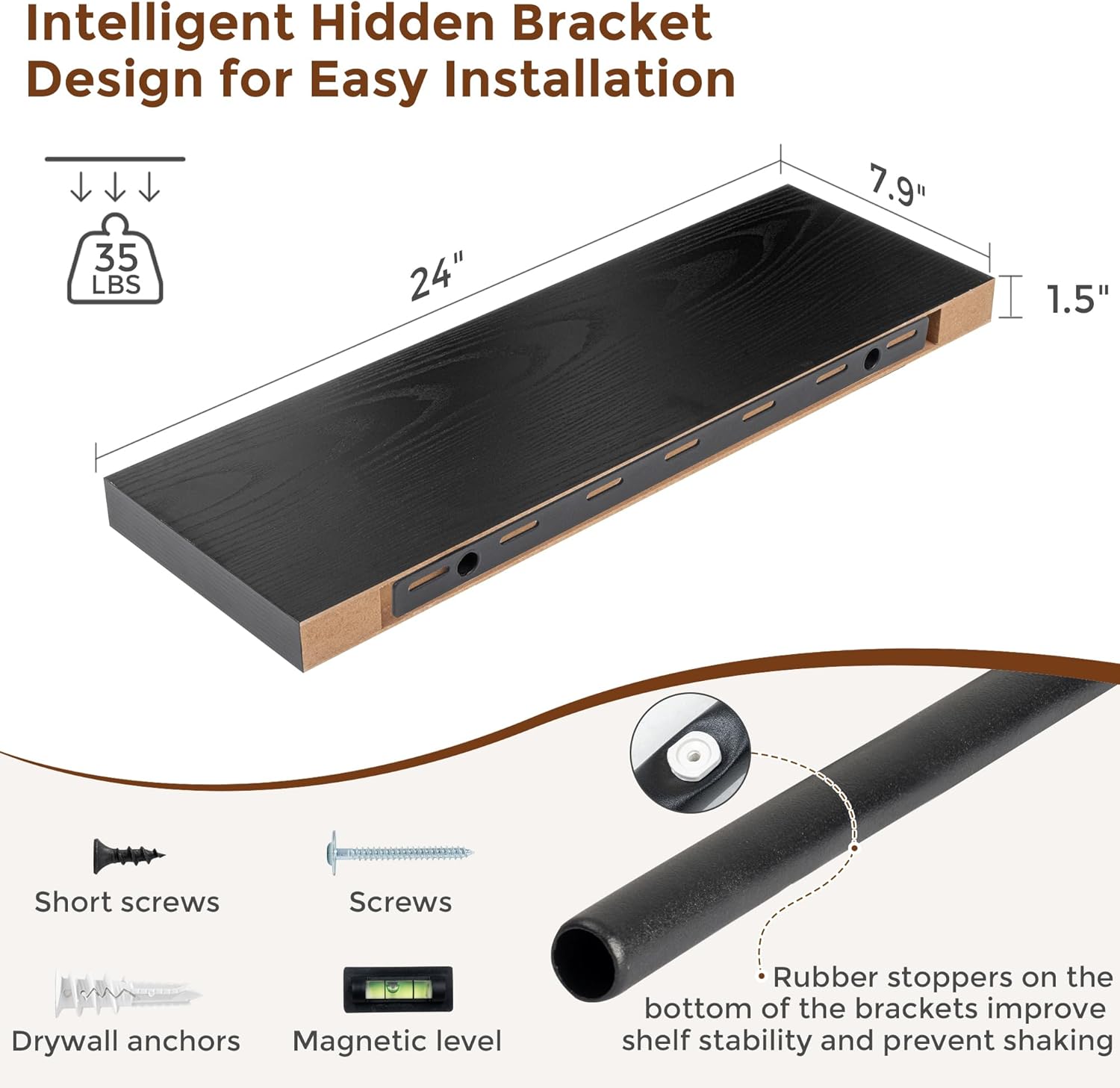 Heimlove 24 Inch Floating Shelves for Wall Black Shelves Set of 2,Wall Mounted Rustic Wood 8 Inch Deep Floating Shelf with Invisible Brackets for Bedroom Kitchen Living Room