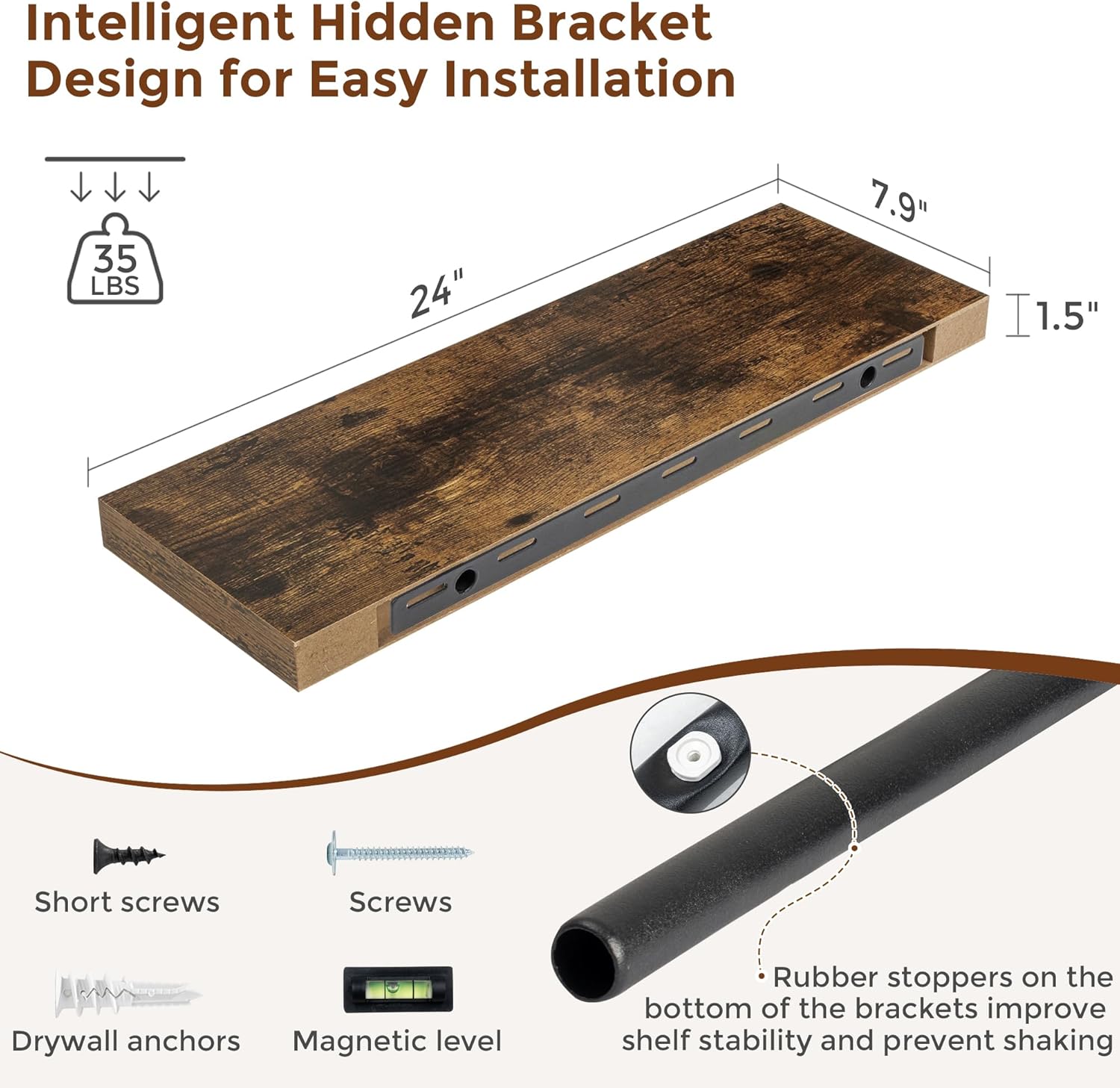 Heimlove 24 Inch Floating Shelves for Wall Rustic Brown Shelves Set of 2,Wall Mounted Rustic Wood 8 Inch Deep Floating Shelf with Invisible Brackets for Bedroom Kitchen Living Room