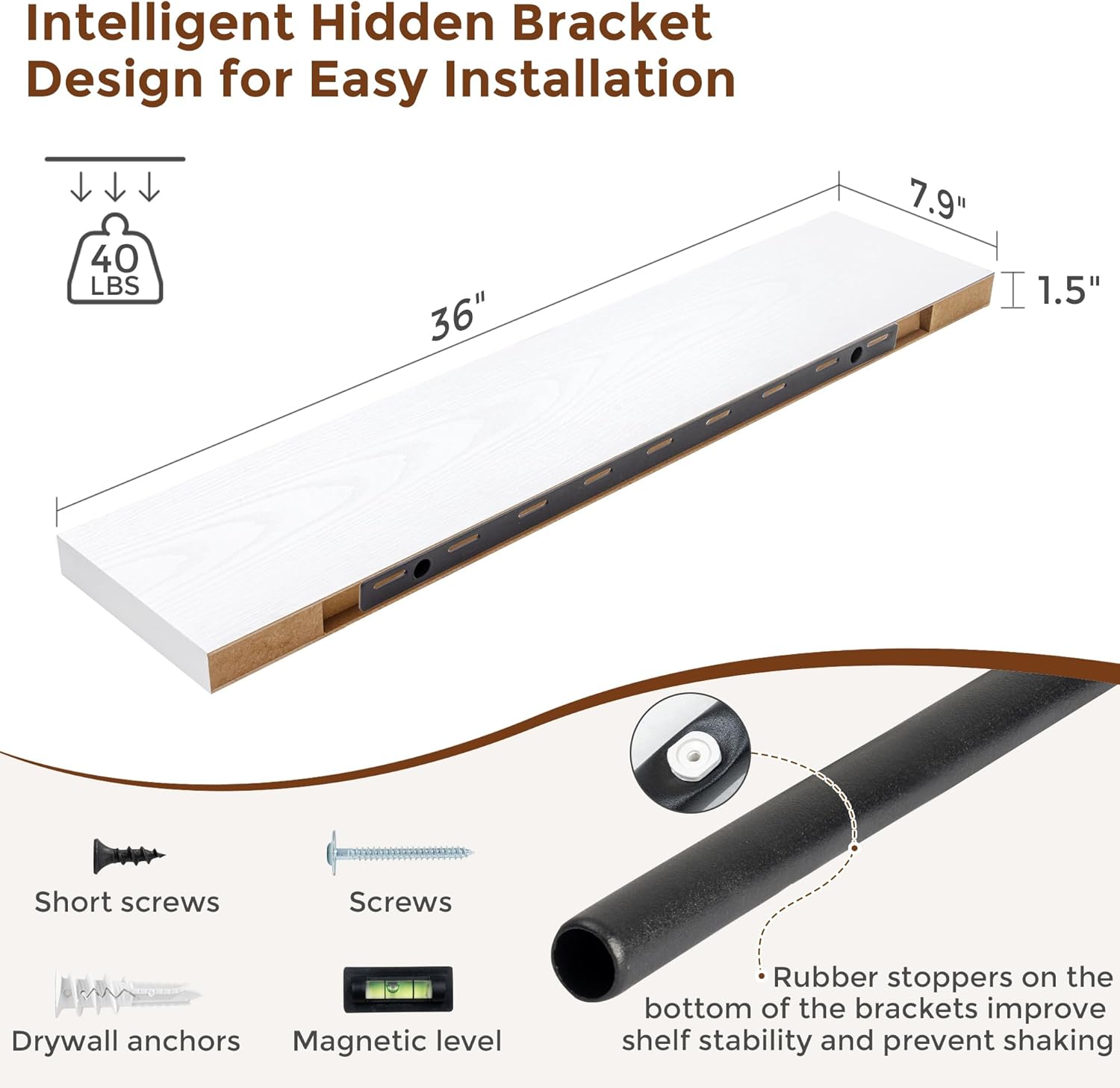 - 【Sturdy Support】Make the most of your wall space with our 36 x 8 inch white floating shelves for wall for room wall. At 1.5 inches thick, they offer sturdy support for your plants and decorative pieces. Each shelf can hold up to 30 lbs, ensuring your items never sag or fall.