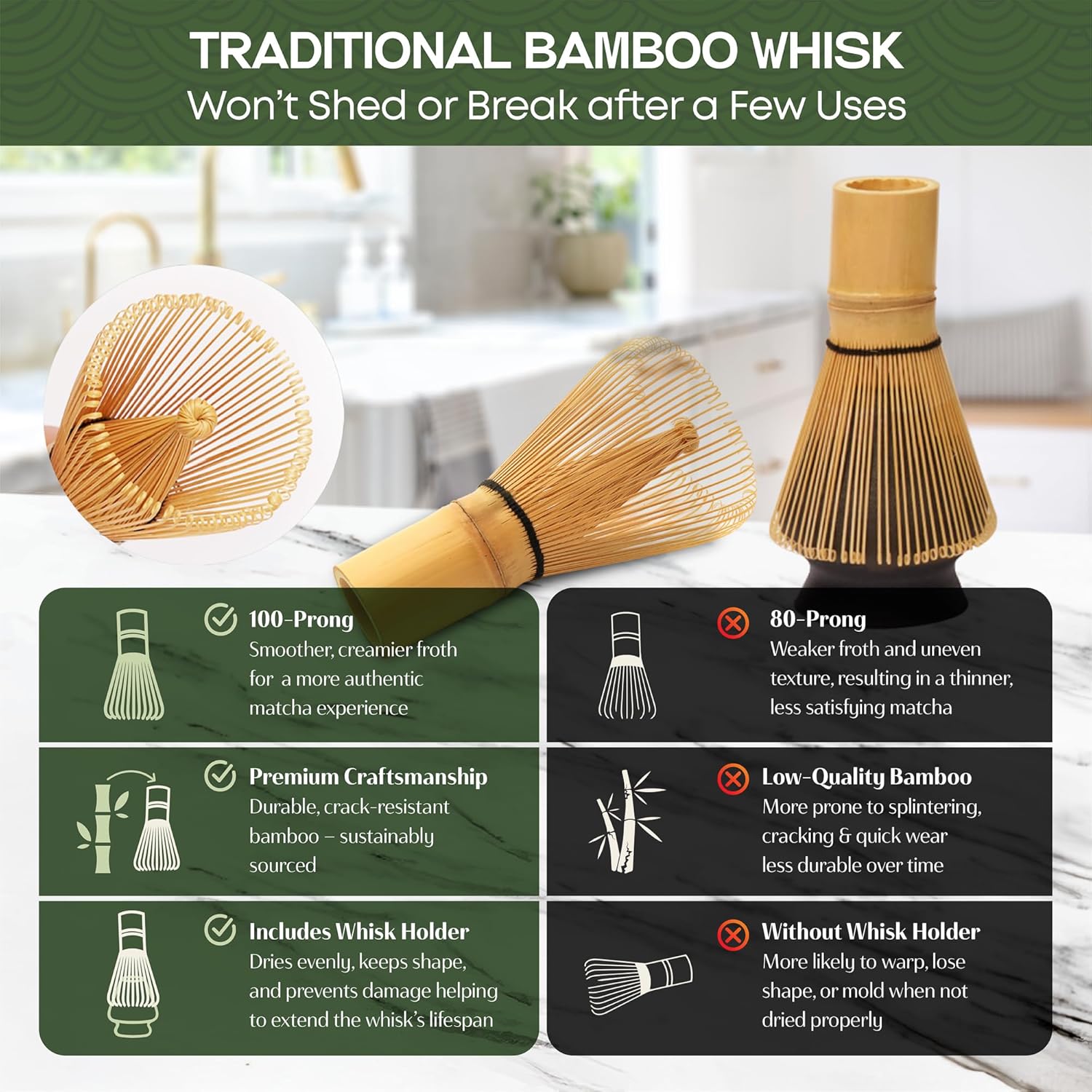 - 100 Prong Whisk, Cafe Style Froth at Home - Our 100 prong whisk creates a luxuriously smooth, creamy froth that outperforms standard whisks, ideal for matcha lovers who value authentic tradition and exceptional quality in every cup.
