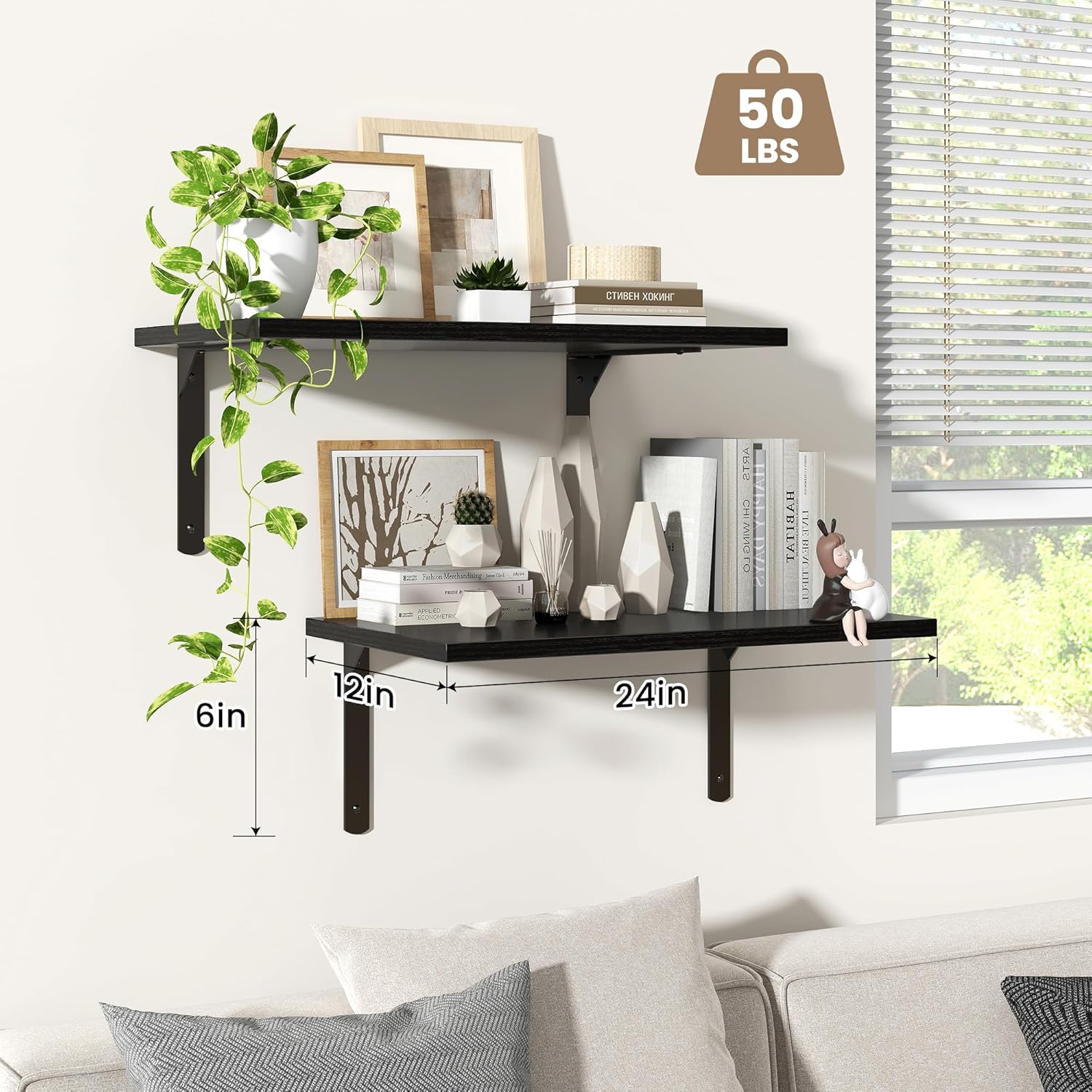 - 【Strong & Durable Construction for Long-Lasting Use】Constructed from high-quality, smooth-finished MDF, these wall shelves provide a sturdy and attractive foundation that resists warping and scratching over time. The robust black L-shaped metal brackets are designed from industrial-grade steel, ensuring excellent support and stability. Each shelf can bear up to 50 lbs when properly installed, allowing you to confidently store heavier items like books, cookware, or collectibles without worry.