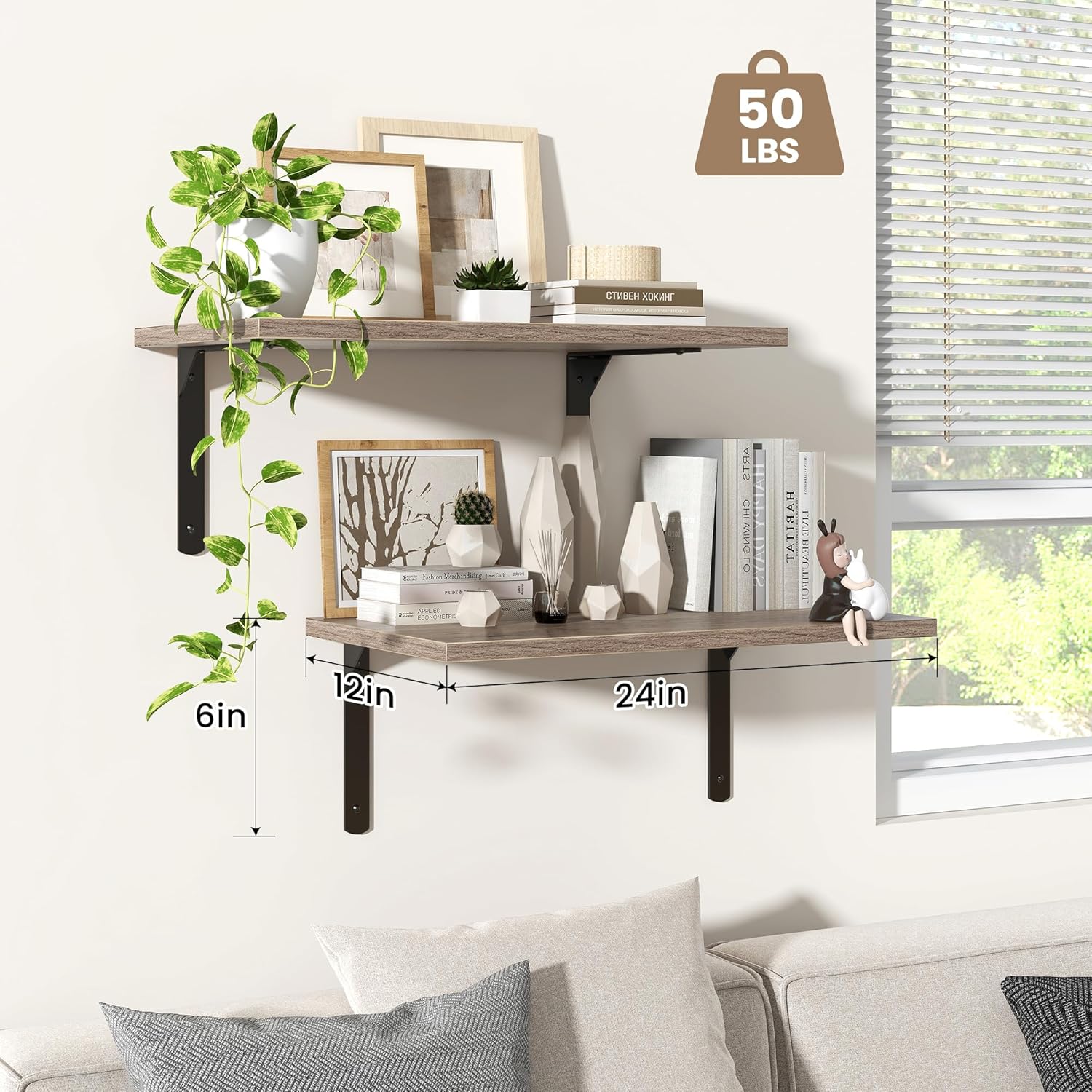 - 【Strong & Durable Construction for Long-Lasting Use】Constructed from high-quality, smooth-finished MDF, these wall shelves provide a sturdy and attractive foundation that resists warping and scratching over time. The robust black L-shaped metal brackets are designed from industrial-grade steel, ensuring excellent support and stability. Each shelf can bear up to 50 lbs when properly installed, allowing you to confidently store heavier items like books, cookware, or collectibles without worry.
