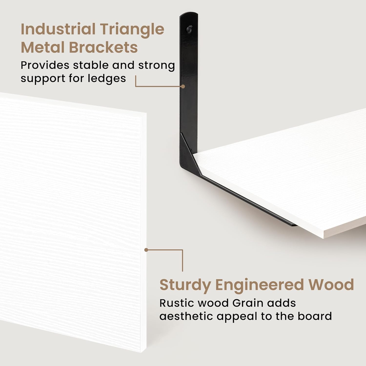 - 【Strong & Durable Construction for Long-Lasting Use】Constructed from high-quality, smooth-finished MDF, these wall shelves provide a sturdy and attractive foundation that resists warping and scratching over time. The robust black L-shaped metal brackets are designed from industrial-grade steel, ensuring excellent support and stability. Each shelf can bear up to 50 lbs when properly installed, allowing you to confidently store heavier items like books, cookware, or collectibles without worry.