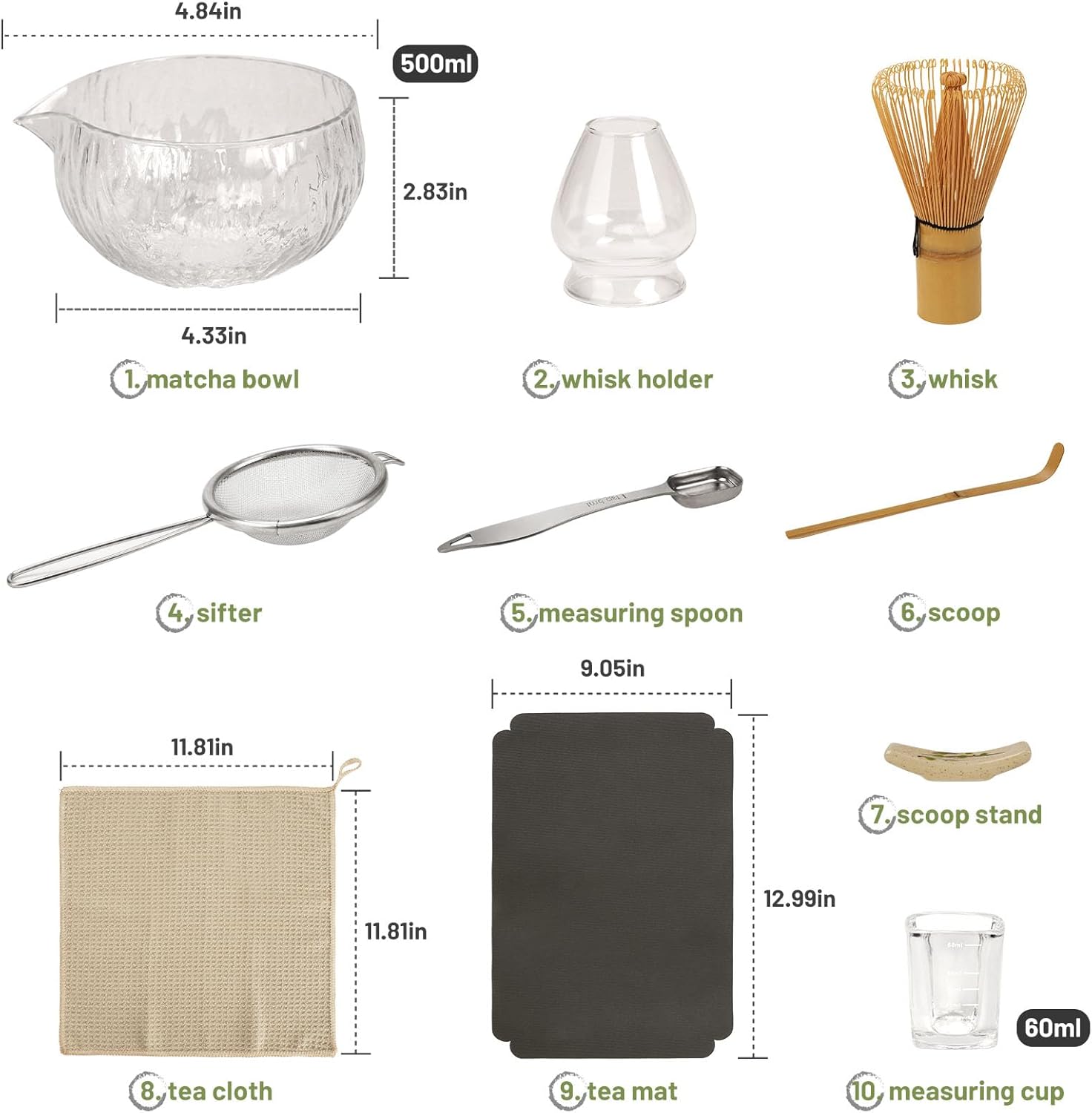 - 10-Piece Matcha Tool Set: It contains a complete set of 8 matcha making tools and 2 measuring implements. Designed after traditional Japanese matcha utensils, this matcha kit helps make authentic Japanese matcha for matcha lovers, taking you through the elegant, traditional way of tea tasting (This bowl and whisk set includes no green tea powder)