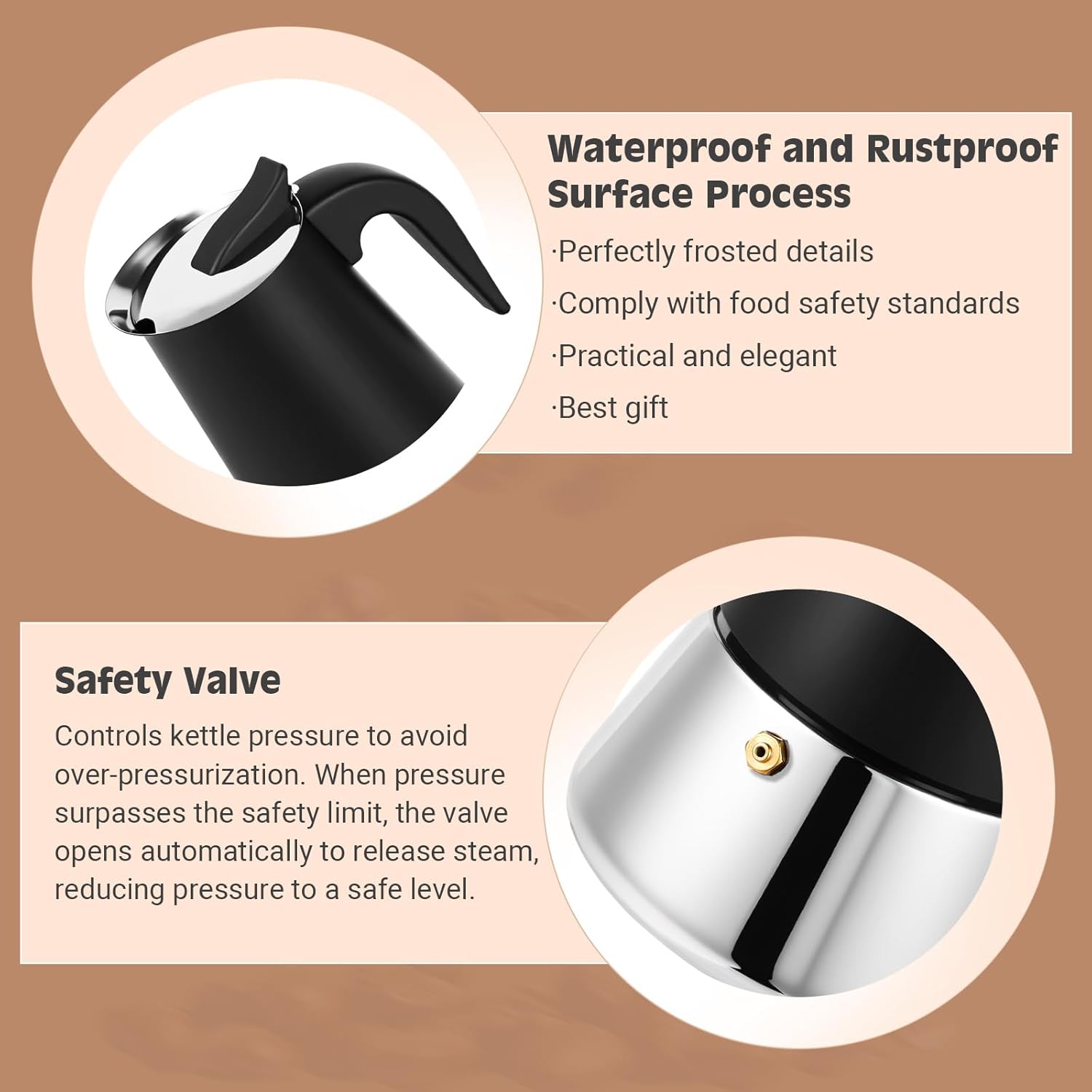 - HIGH-QUALITY 304 STAINLESS STEEL: Made of food-safe 304 stainless steel, compliant with EN13248. Our mocha pot resists coffee acids/scratches, retaining shine. The inner wall of the lower pot is sandblasted. Comes in gift-ready packaging