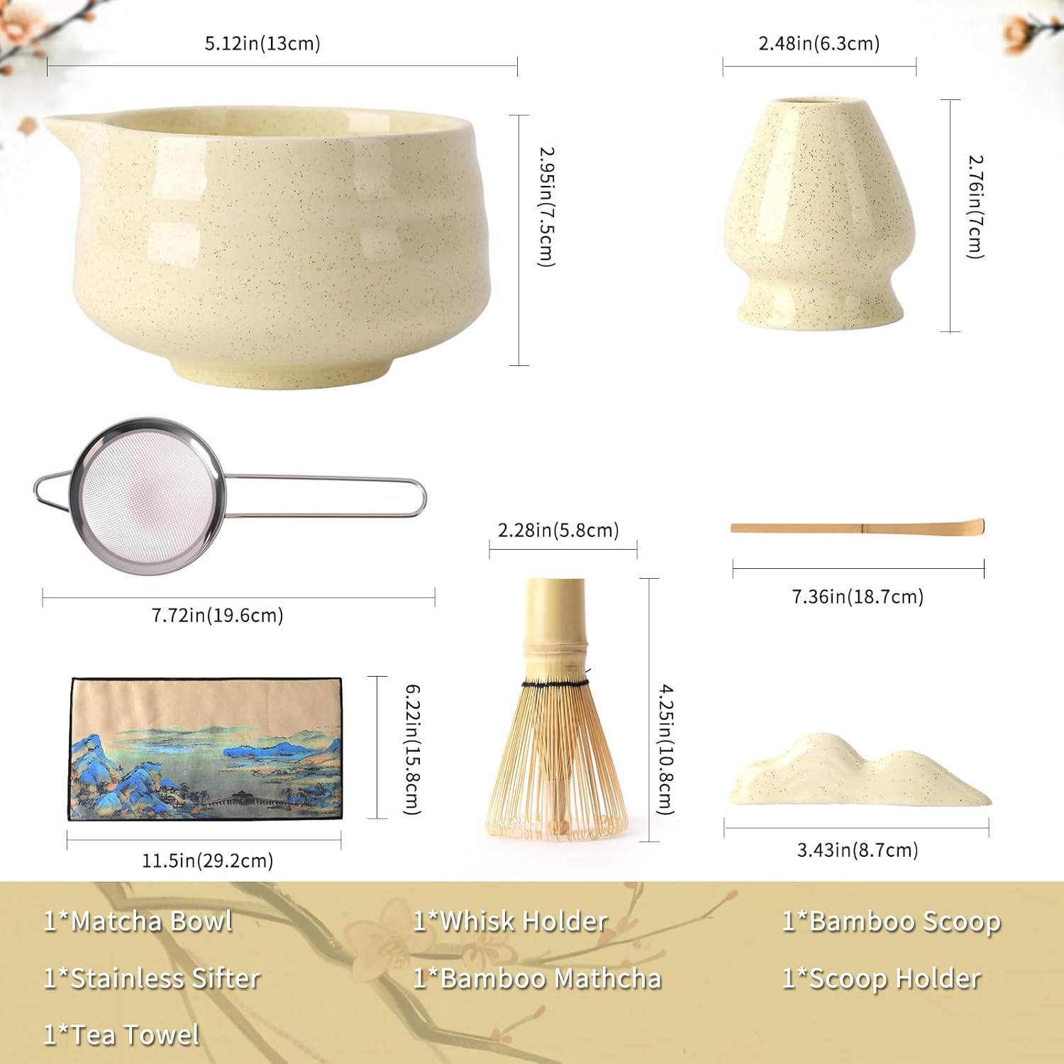 Japanese Matcha Whisk Set - 7-Piece Kit Bamboo Chasen, Ceramic Bowl with Spout, Stainless Steel Sifter & Holder Yellow
