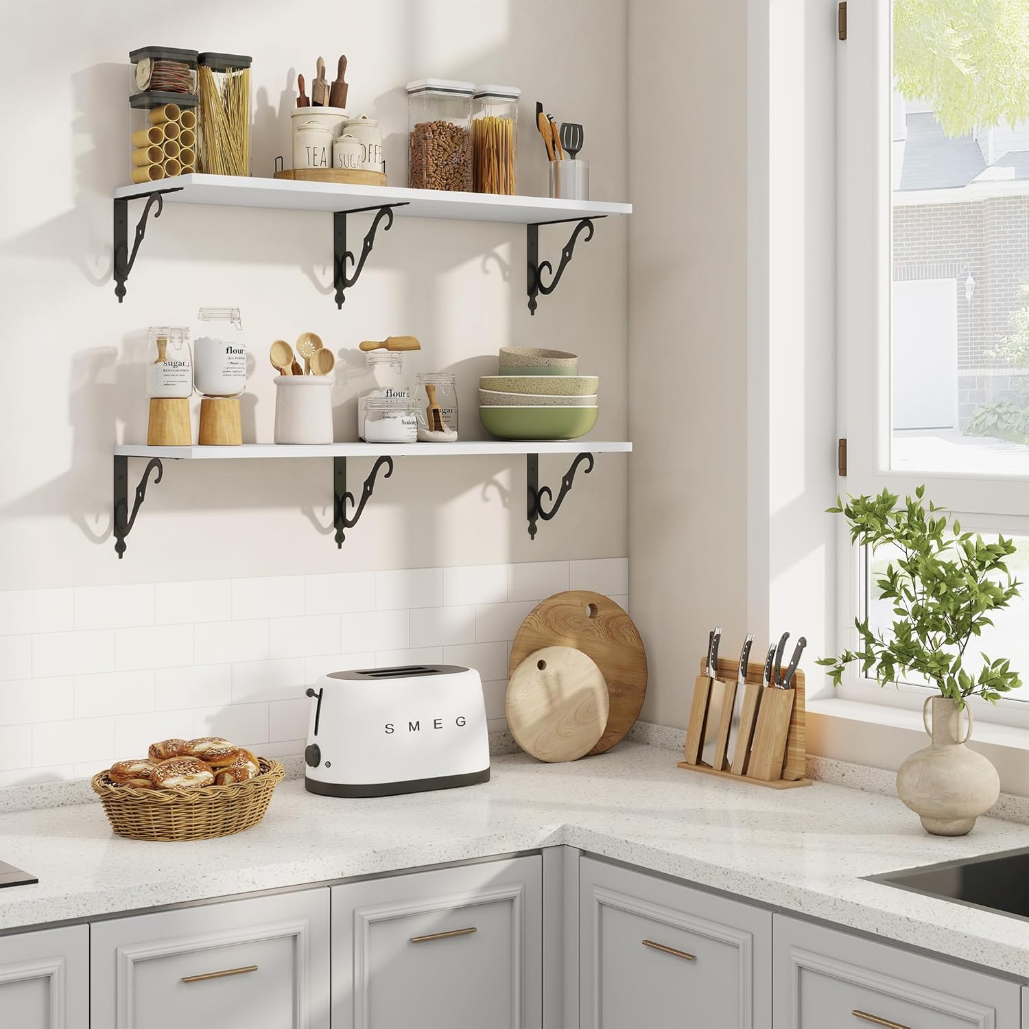 - 12 Inch Deep Floating Shelves: Our rustic deep floating shelves are made of high-quality particle board and sturdy brackets. The classic S-shaped brackets are designed to prevent sagging and ensure long-lasting stability. All edges are carefully sanded for a smooth finish