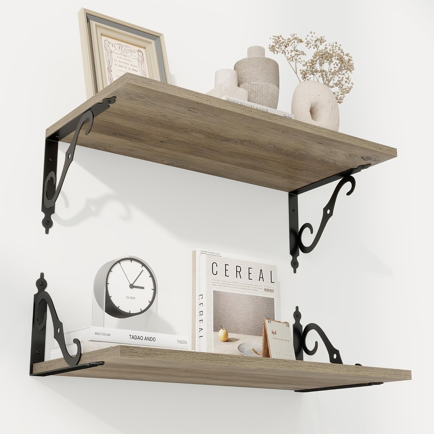 - Perfect Home Decor: This wood shelf fits rustic style, or vintage style home decor, rustic wood grain and exquisite S-shaped brackets will make your home full of modern and elegant romance. Our floating shelf makes full use of the wall, and let your room and bathroom look so cute. The bracket can be installed above or below the board according to space and usage to create your unique home style