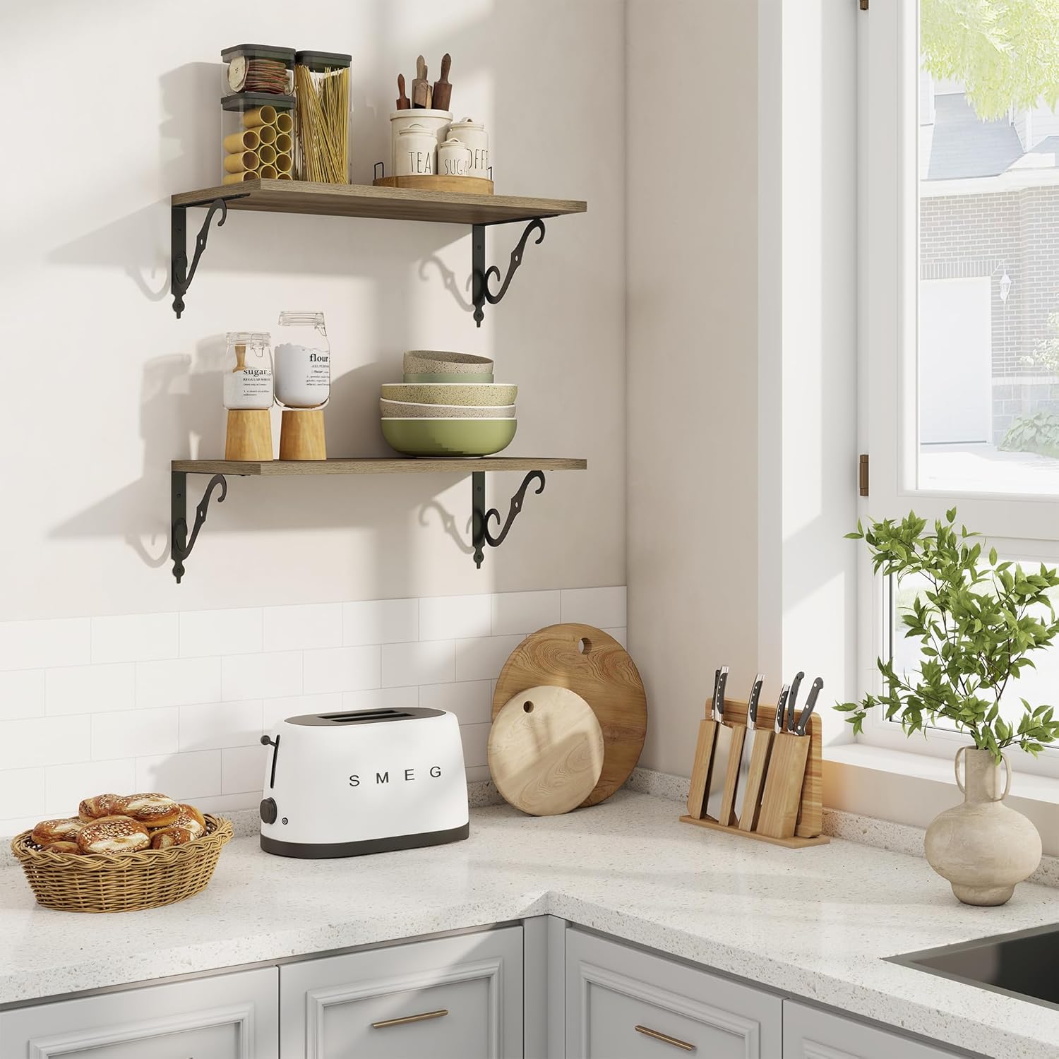 - 12 Inch Deep Floating Shelves: Our rustic deep floating shelves are made of high-quality particle board and sturdy brackets. The classic S-shaped brackets are designed to prevent sagging and ensure long-lasting stability. All edges are carefully sanded for a smooth finish