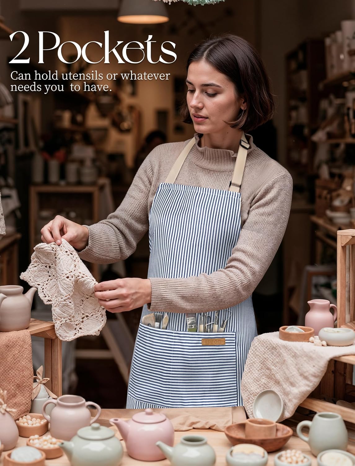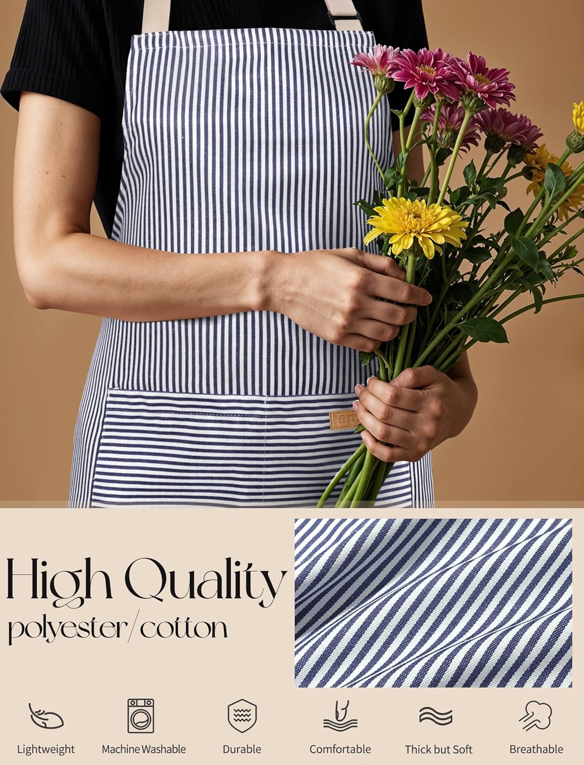 - PREMIUM MATERIAL: This apron with pockets is made of high quality polyester/cotton color woven fabric, which is thicker and more durable than ordinary polyester/cotton fabric, but soft and breathable, and it is not easy to fade, and the stitching is dense and durable for long time use