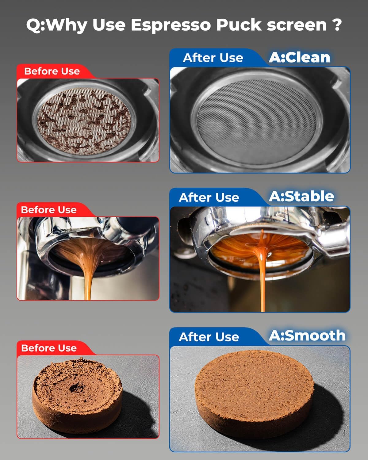 - KEEP THE BREW HEAD CLEAN: The portafilter screen effectively separates the coffee powder from the brewing head, allowing it to stay clean. It is easier to clean than most other puck screens on the market, fine powder cannot be hidden, and the usage time may be extended.