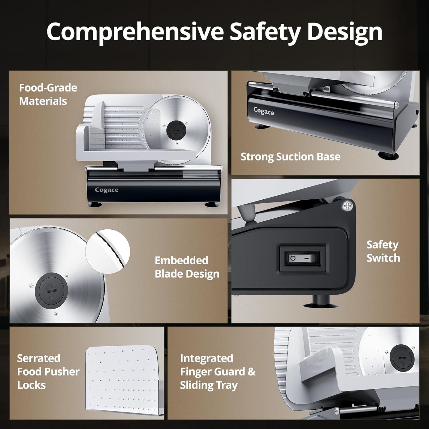 - 【🛡️ Safe & Stable Electric Slicer Design】 Features suction feet, LED power switch, food pusher & tray guard for secure operation. Made from BPA-free, food-grade materials.