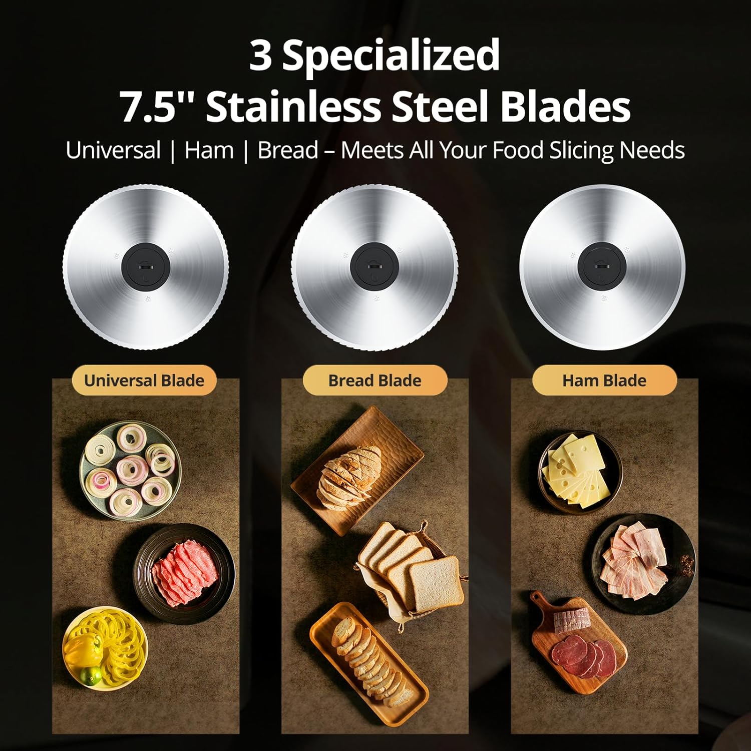 - 【🔪 3 Interchangeable 7.5" Stainless Steel Blades】 Includes a universal blade for general use, a smooth blade for ham & cheese, and a wave blade for bread—perfect versatility for any kitchen.