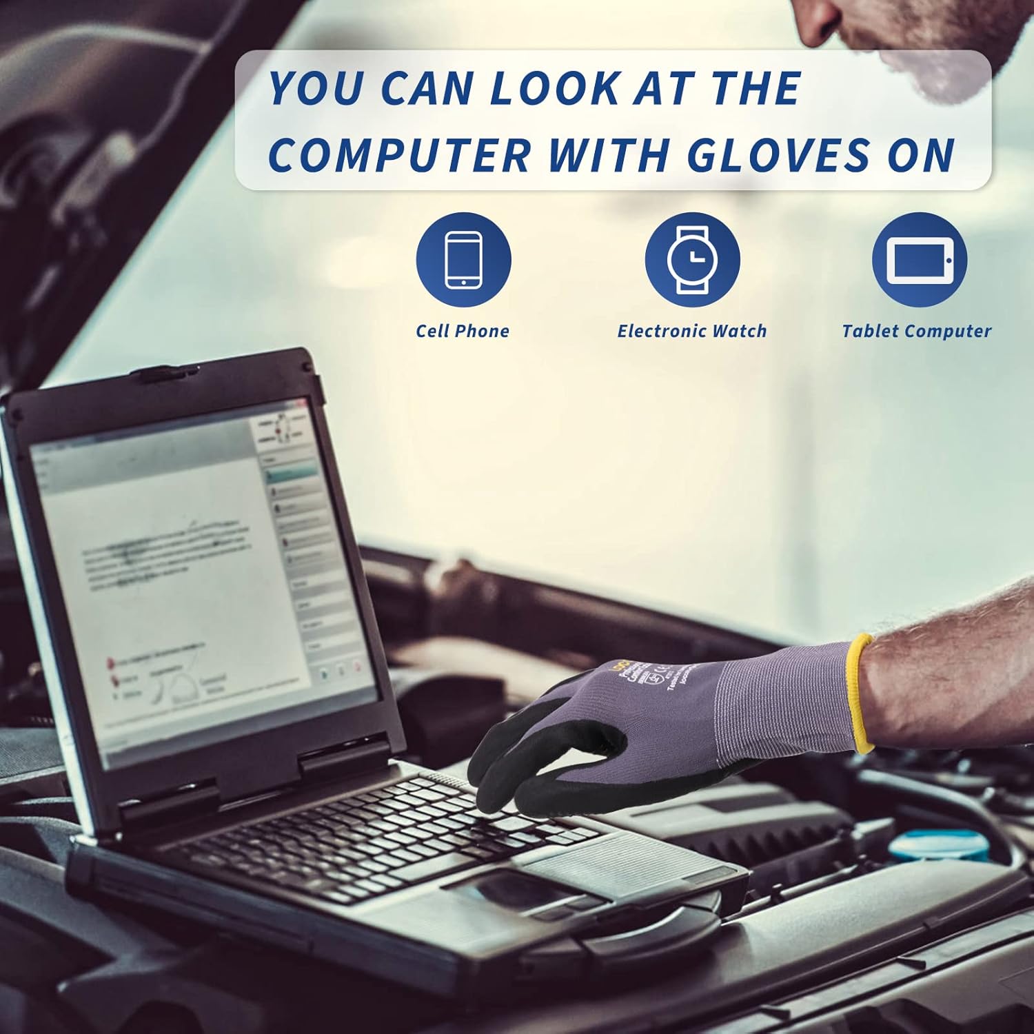 - SUPERIOR GRIP and EXCELLENT DEXTERITY:Micro-Foam Nitrile coatings are compatible with light oils and will provide a good grip and excellent abrasion resistance.Economic designed comfortable 3D snug fit into all fingers.