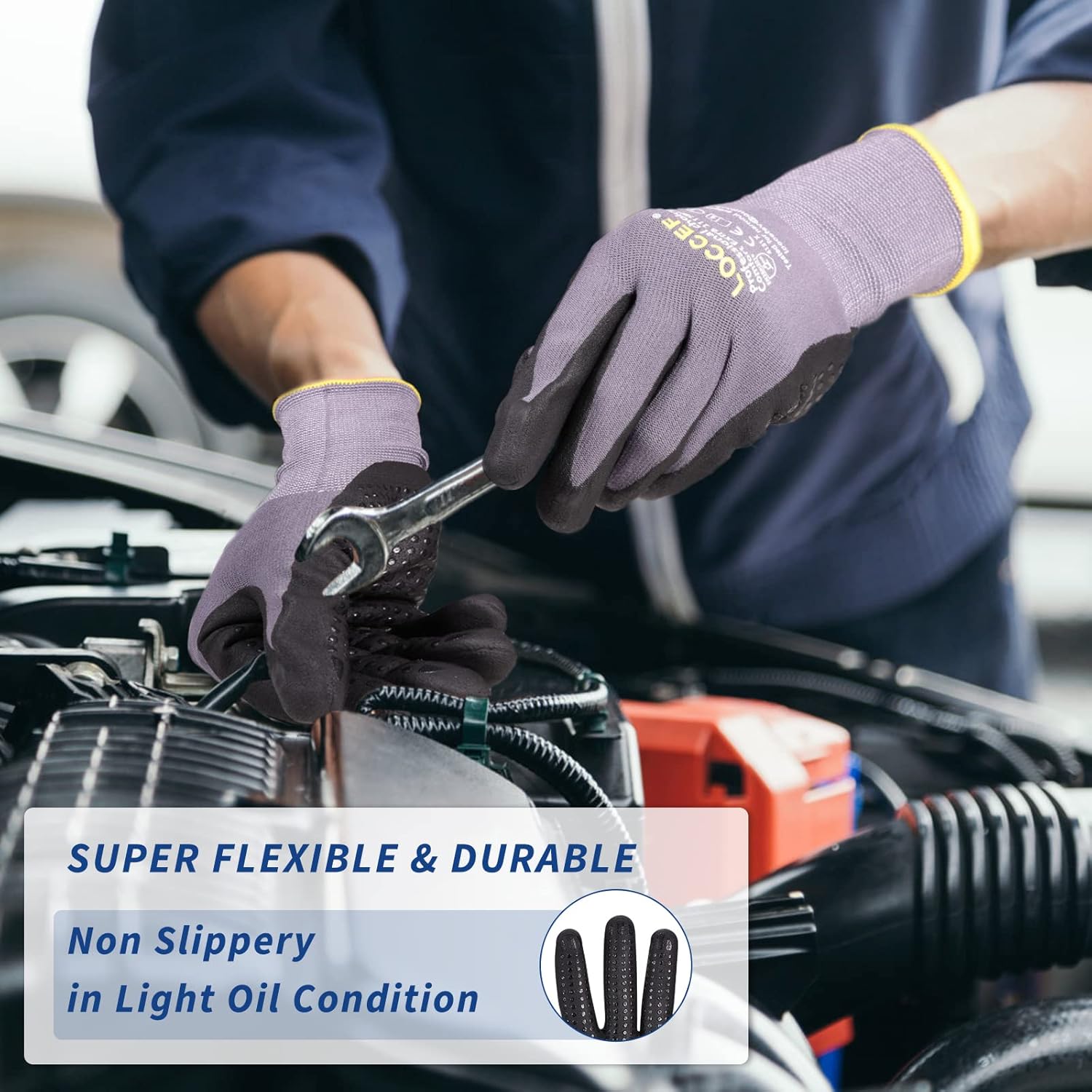 - SUPERIOR GRIP and EXCELLENT DEXTERITY:Micro-Foam Nitrile coatings are compatible with light oils and will provide a good grip and excellent abrasion resistance.Economic designed comfortable 3D snug fit into all fingers.