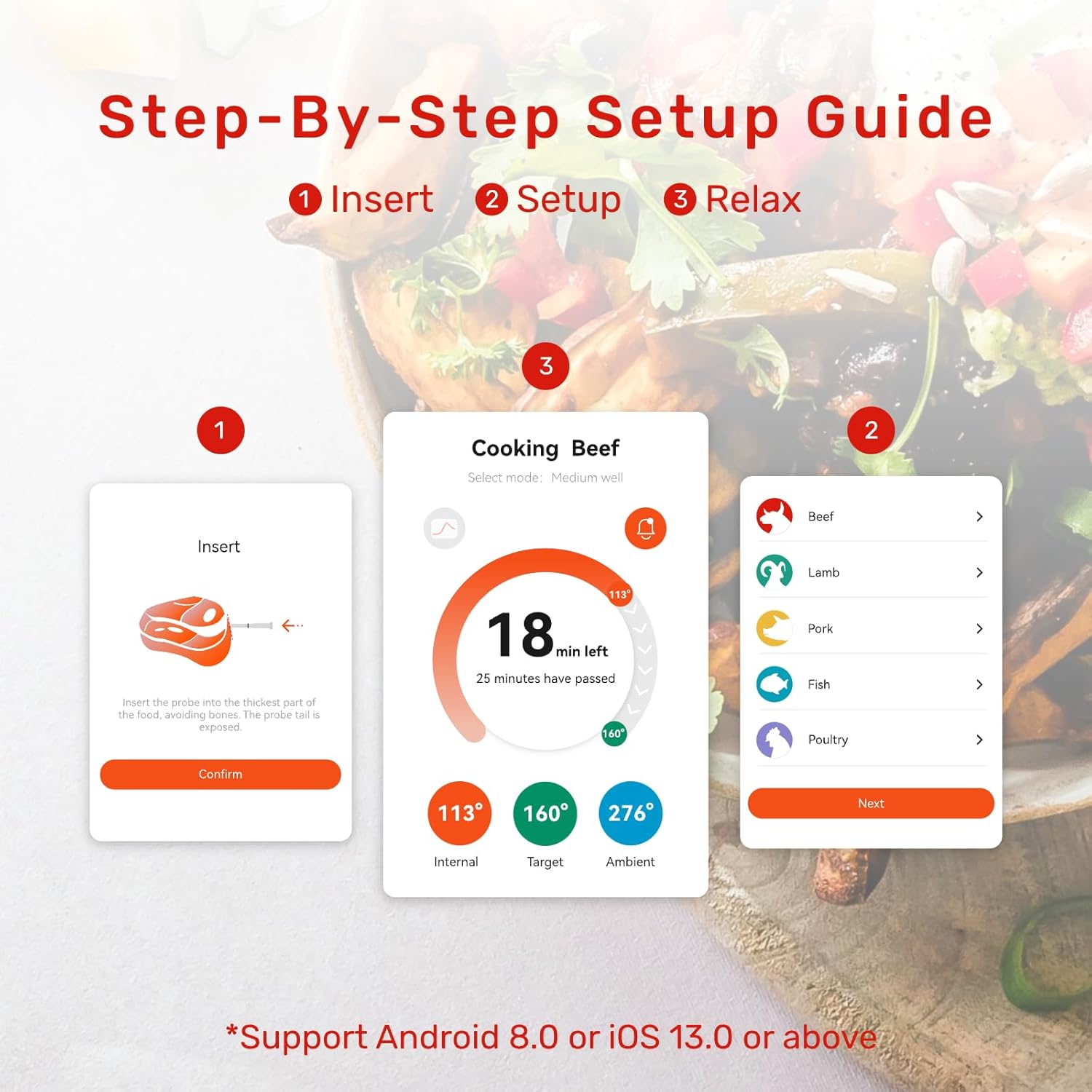 - Smart Cookery: Monitor your cooking progress remotely via the Meatmeet app. The built-in meat temperature guide achieves precise doneness, keeping meat tender and juicy. It alerts you when the preset temperature is reached for easy, perfect cooking
