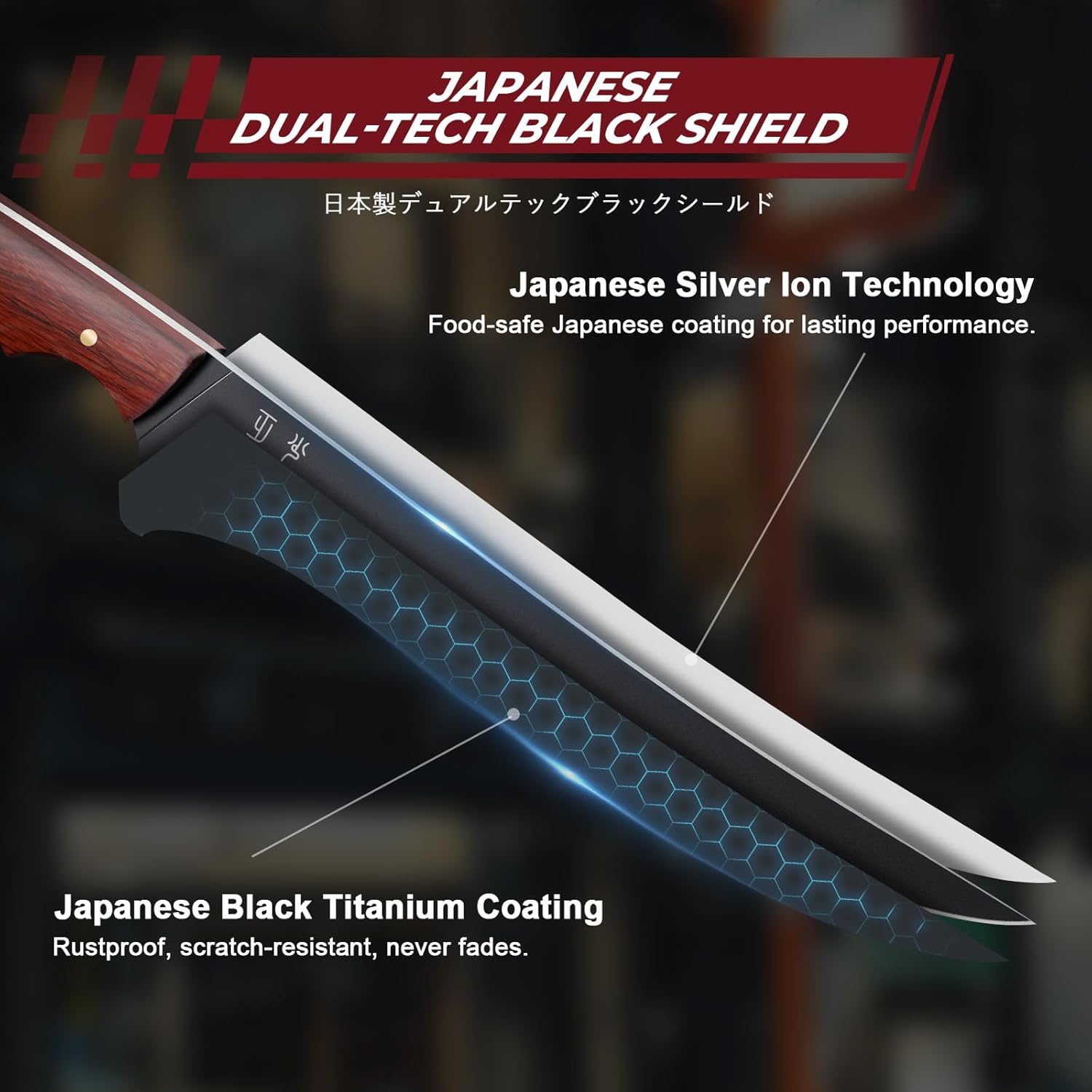 - Dual-Tech Black Shield – Superior Coating TechnologyThis kitchen knife features Japan’s exclusive Dual-Tech Black Shield coating—a combination of refined silver-tone finishing and ultra-durable black titanium plating. The surface with a sleek matte finish that’s easy to clean and built to last. Designed to perform under the rigors of daily kitchen use, it maintains its elegant appearance without peeling or fading over time.