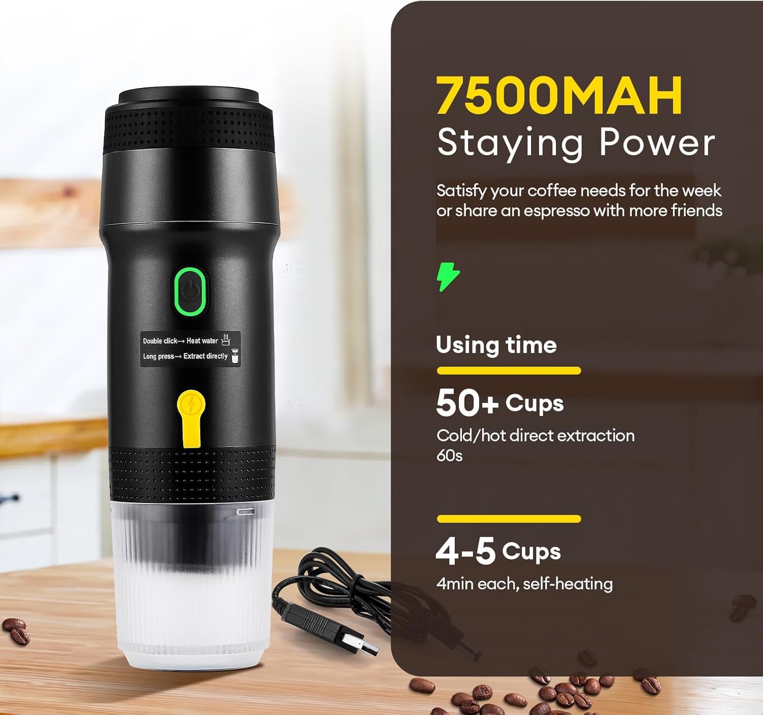 - 【Upgrade One-Button Operation Portable Coffee Maker】Travel coffee maker is a great device for flavored espresso lovers, you can easy enjoy Espresso on the way go even with no Espresso Machine, just one tap, no matter where you are. It’s easy to use, efficient, and delivers a delicious cup of espresso every time.able Electric Espresso Machine