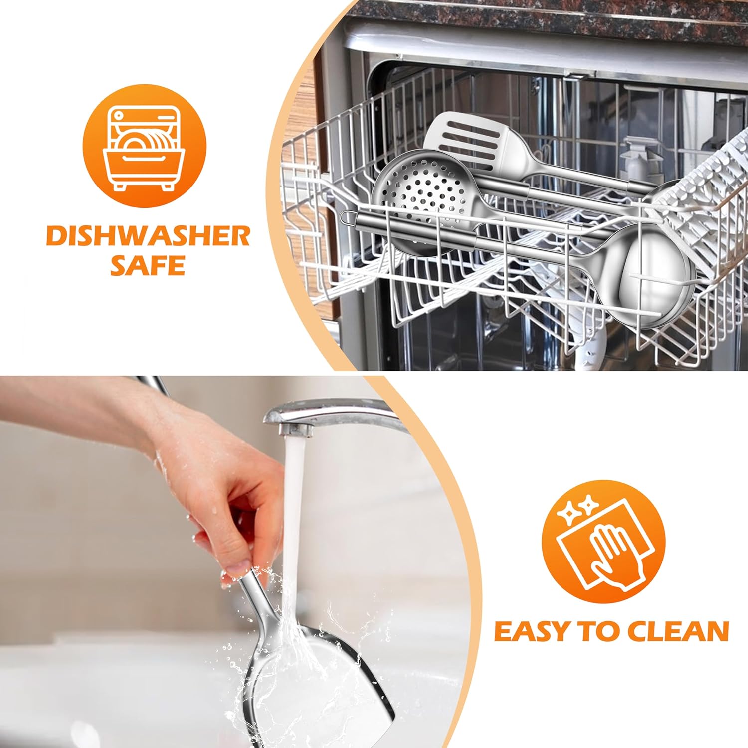 - EASY TO CLEAN & DISHWASHER SAFE: Stainless steel kitchenware has a smooth surface and is easy to clean by hand with soap or warm water, Dishwasher safe to make cleaning easier and make cooking more convenient (Tip: Do not clean and rub the utensil with hard materials to keep it shiny)