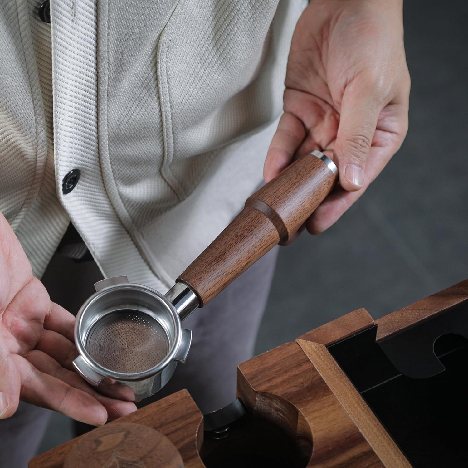 - Made from solid natural walnut and precision-machined components, this portafilter delivers a professional feel with long-lasting durability. Includes a high-quality 18–21g double shot basket to ensure even flow and rich crema