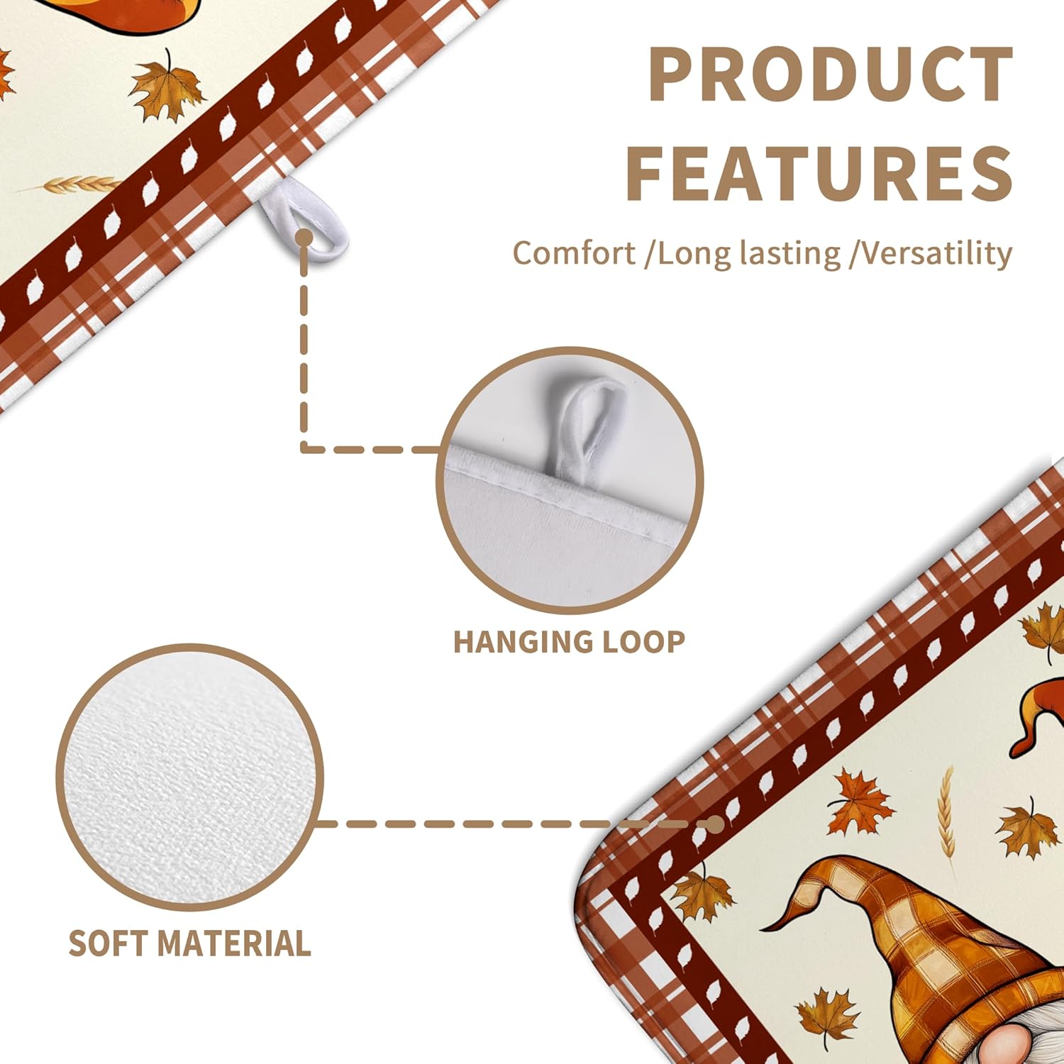 - [Multi-functional]: This Fall Gnomes dish drying mat can be placed under the dish rack to collect dripping water to keep the counter dry and clean, or you can place bottles, pots, plates, bowls, cups and other utensils directly on the mat. Fall Pumpkin Rustic Large dish drying mat can also be placed under the coffee machine to absorb spilled coffee.