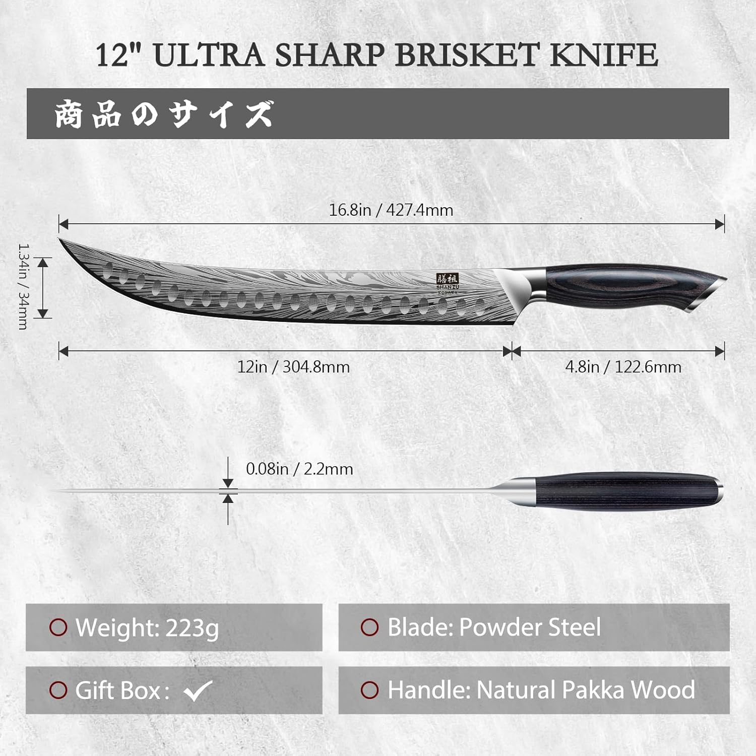 SHAN ZU Butcher Knife in High Carbon Powder Steel, 12 Inch Brisket Knife for Meat Cutting, Carving and Slicing Knives with Ergonomic Pakkawood Handle, Ultra Sharp Meat Breaking Knives