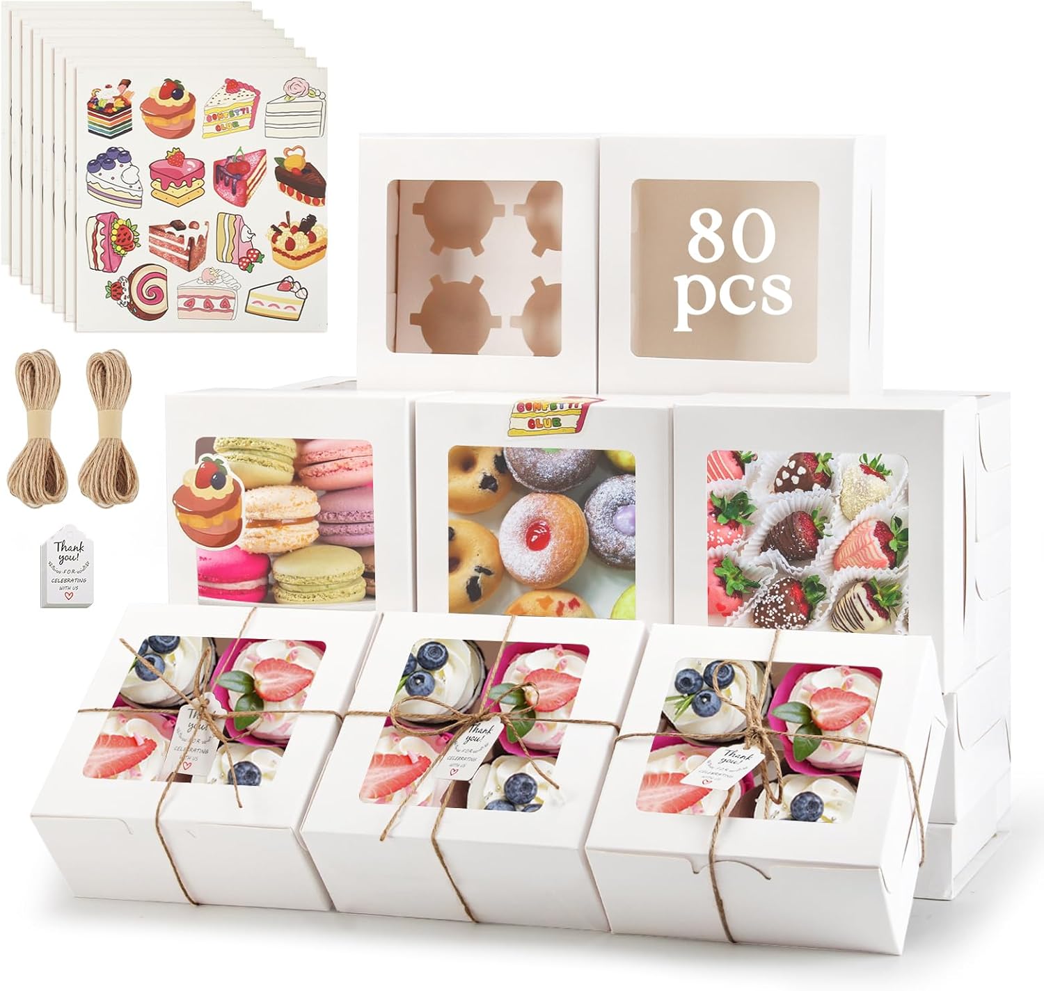 - [Cake Stickers and Twine for Personalization] Comes with assorted cake-themed stickers and natural jute twine so you can add a personal touch to each cupcake box. Create charming, customized packaging that delights your customers, friends, and family.