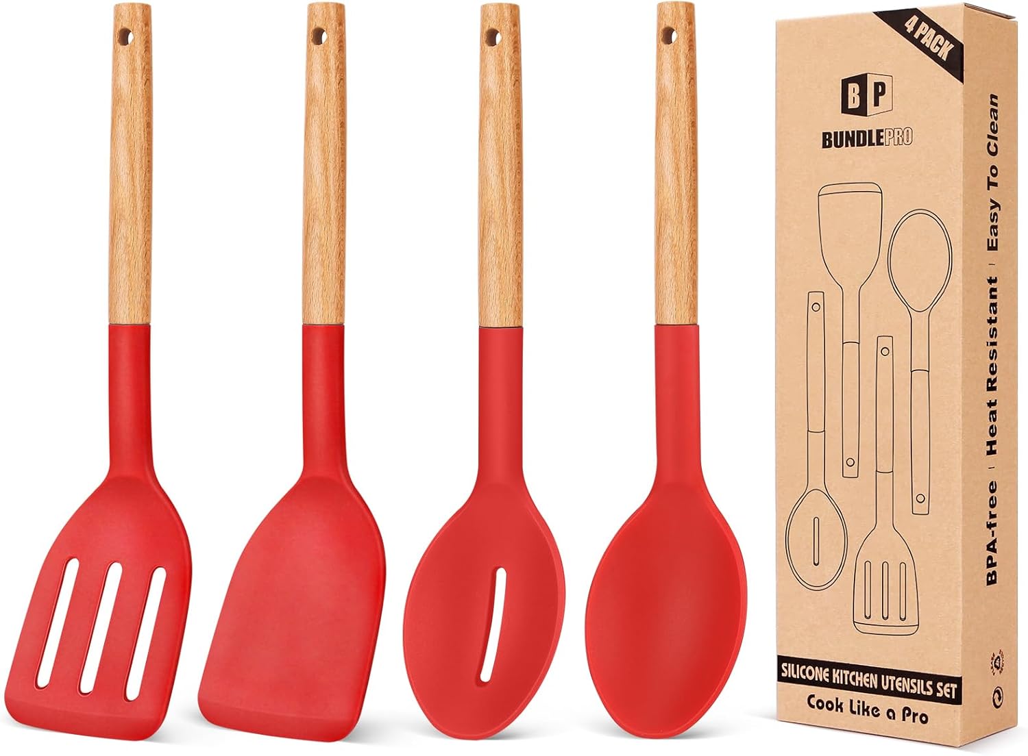 Pack of 4 Silicone Cooking Utensils Set, Non Stick Solid Spatulas and Heat Resistant Slotted Spoons with Wooden Handle, Ideal Wood Kitchen Utensils Set for Frying,Serving,Turning,Stirring (RED)