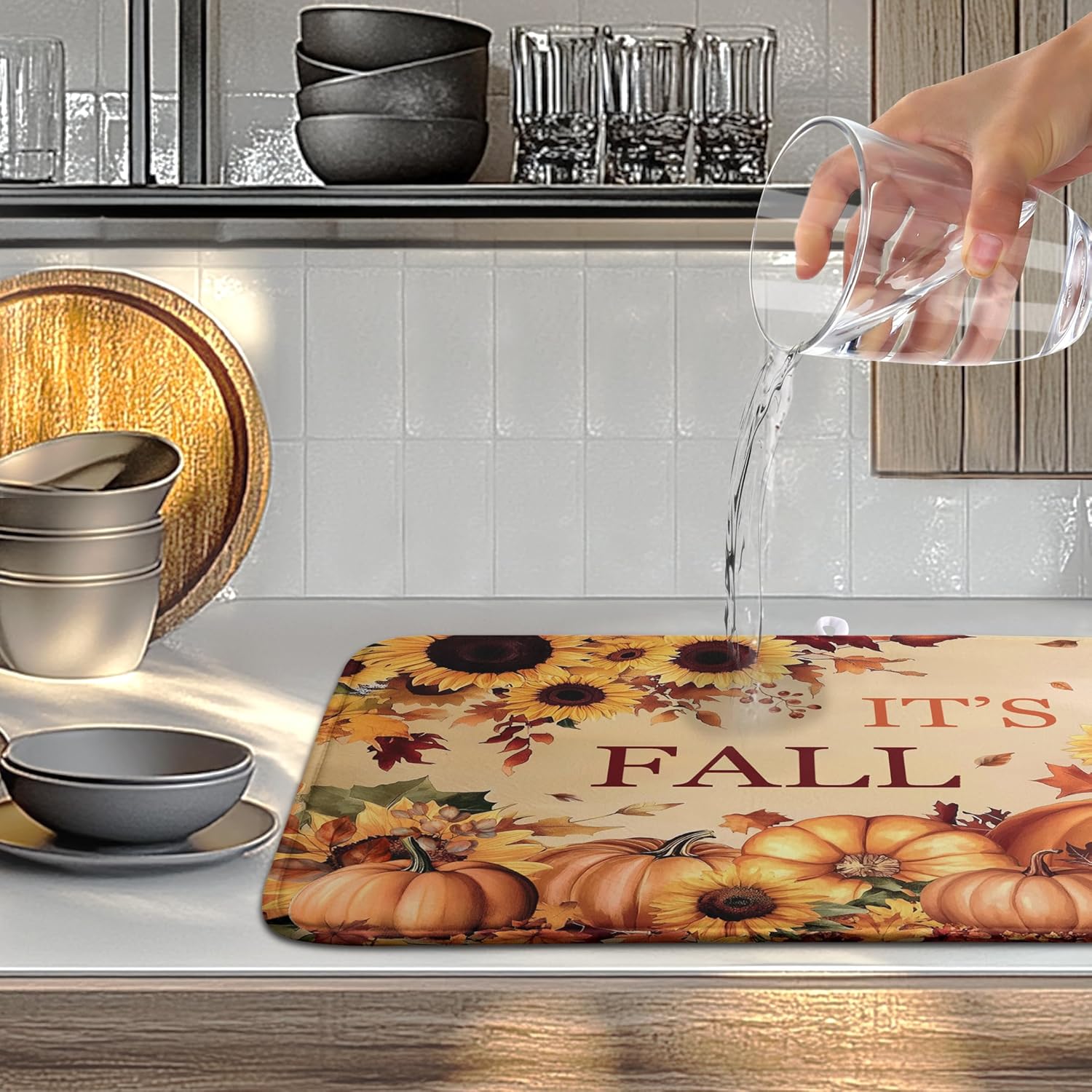 - [Multi-functional]: This FallSunflower Pumpkins Sunflowers dish drying mat can be placed under the dish rack to collect dripping water to keep the counter dry and clean, or you can place bottles, pots, plates, bowls, cups and other utensils directly on the mat. Fall Pumpkin Rustic Large dish drying mat can also be placed under the coffee machine to absorb spilled coffee.