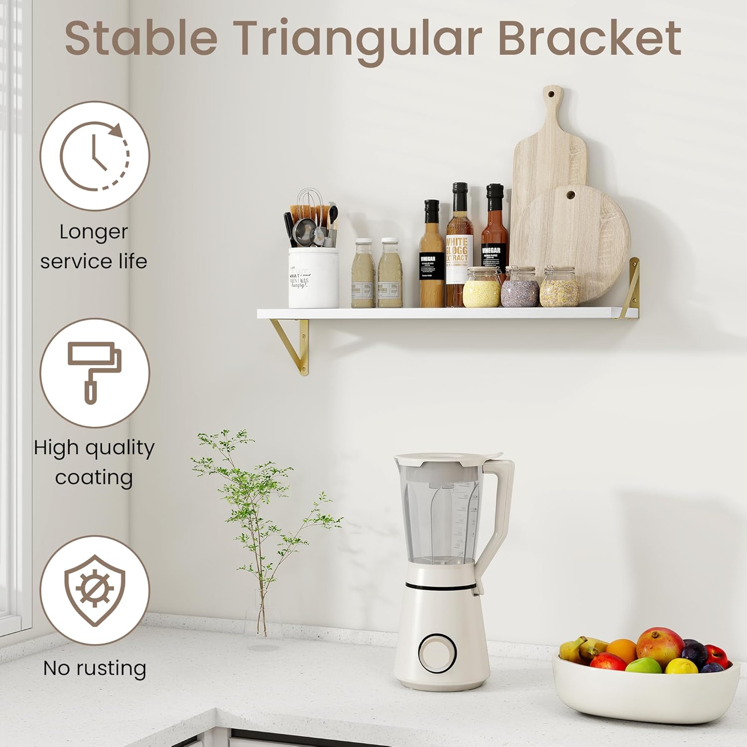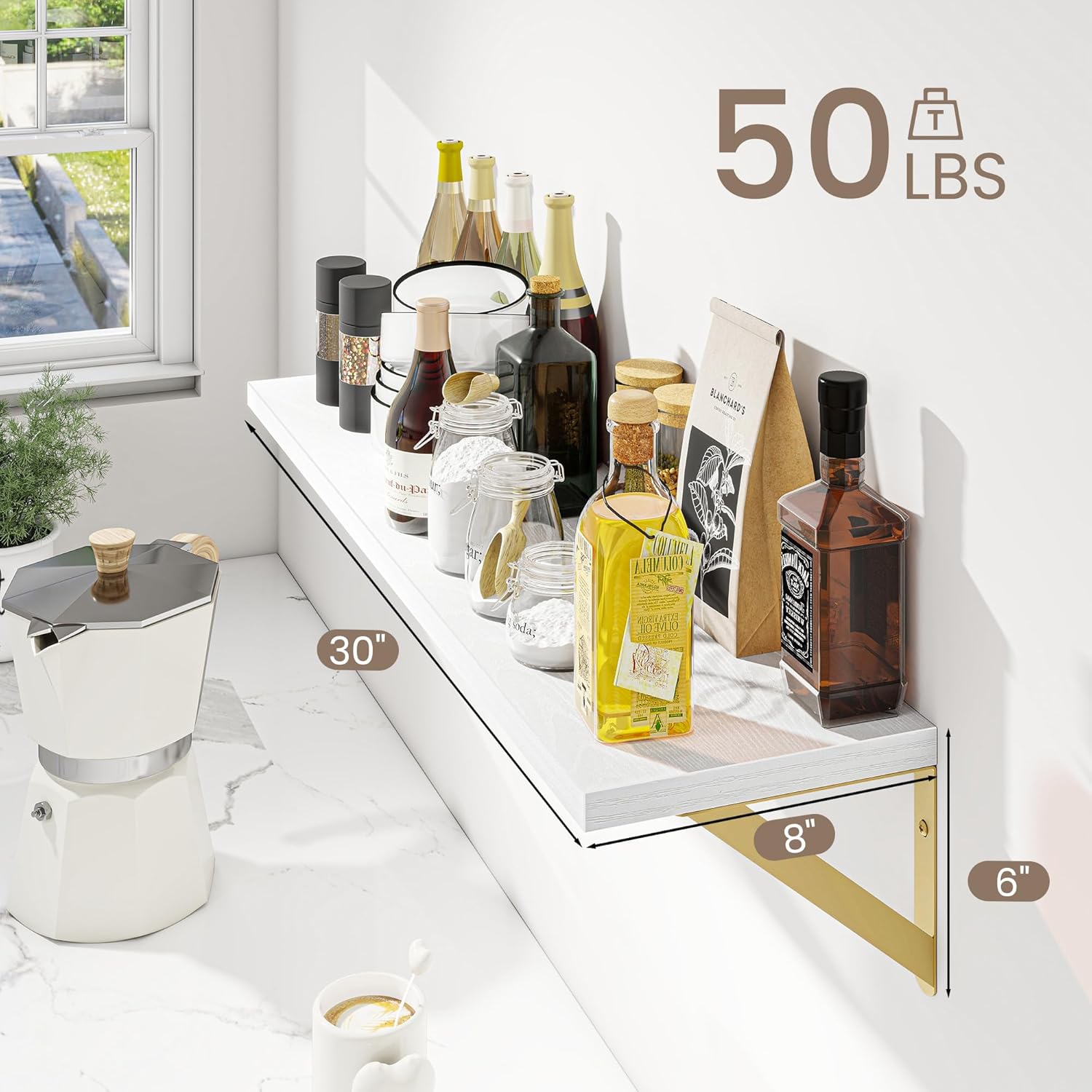 Dreamland Deep Floating Shelves for Wall, 30W x 8D Wall Shelves, Set of 2, 30 inch Floating Shelf with Sturdy Metal Brackets for Living Room, Bathroom, Bedroom and Kitchen, White with Gold Brackets