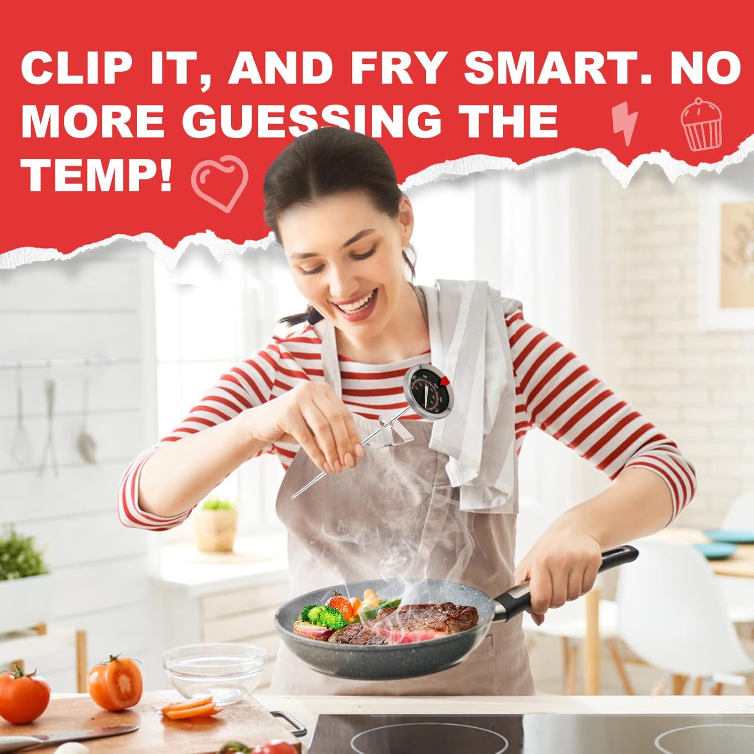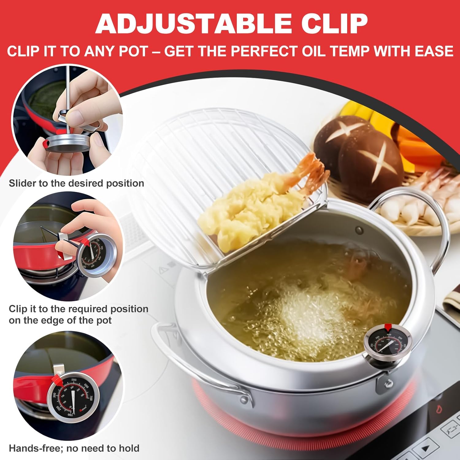 - 【Kitchen Partner】Reinforced pot clip grips 0.2"-1.5" thick cookware edges securely, allowing simultaneous temperature monitoring and stirring during jam making or deep-frying.