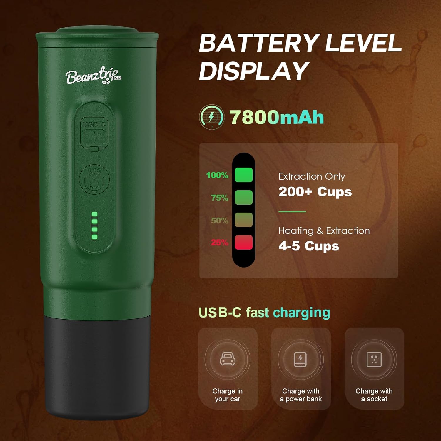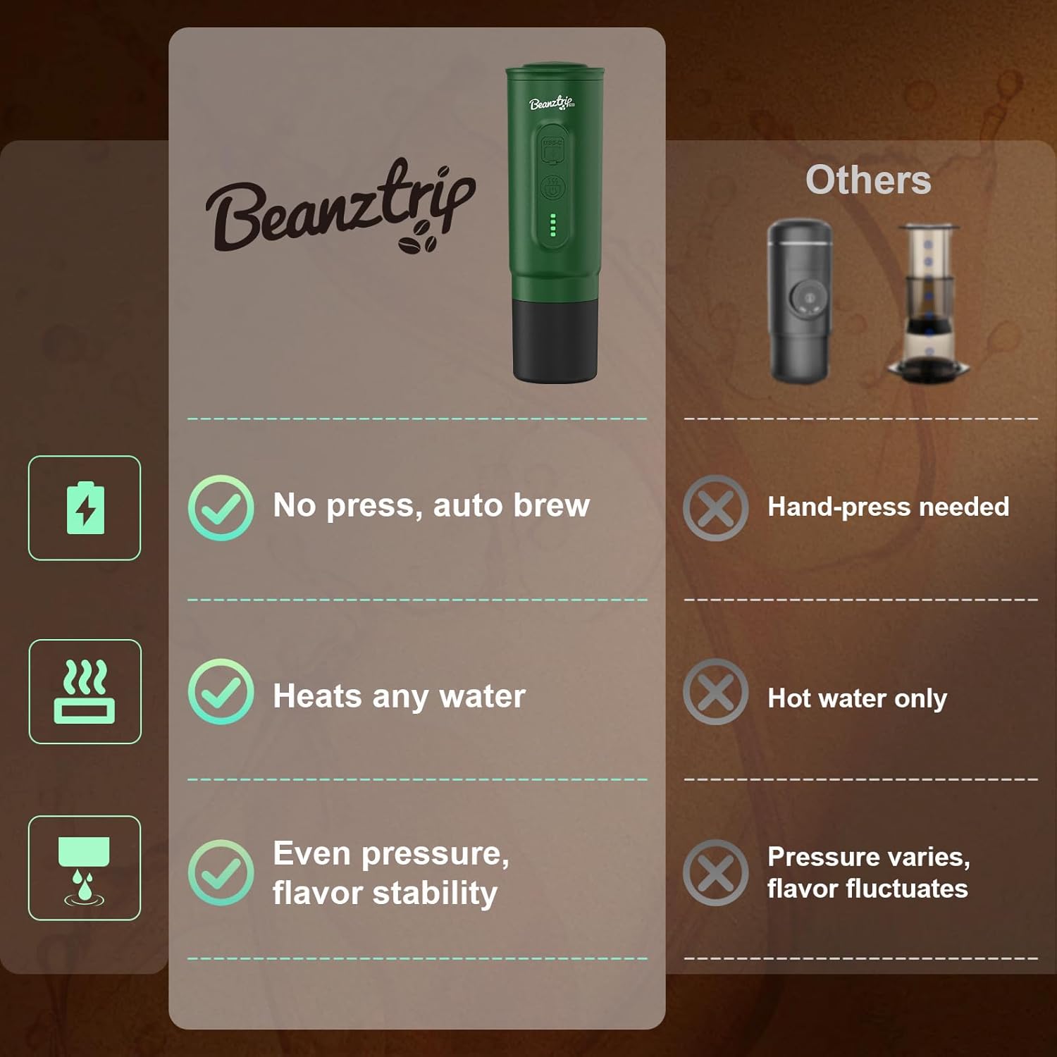 - 【Extended Battery Life】200+ cups per charge - engineered for outdoor! The high-capacity battery heats water for 200+ cups (pre-heated) or 4-5 full brew cycles (from cold to hot). BeanzTrip travel coffee maker is suatible for multi-day trips without power sources