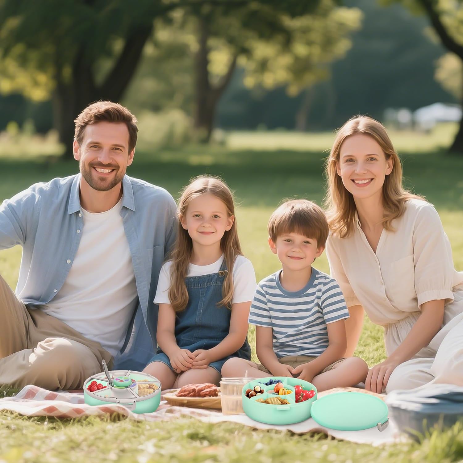 - 2 Unique Snack Containers — One features a fun snack spinner with an interactive button and 5 compartments, while the other offers a simple, classic round design with 6 compartments. The basic version holds up to 720ml of food, making it perfect for families on the go.