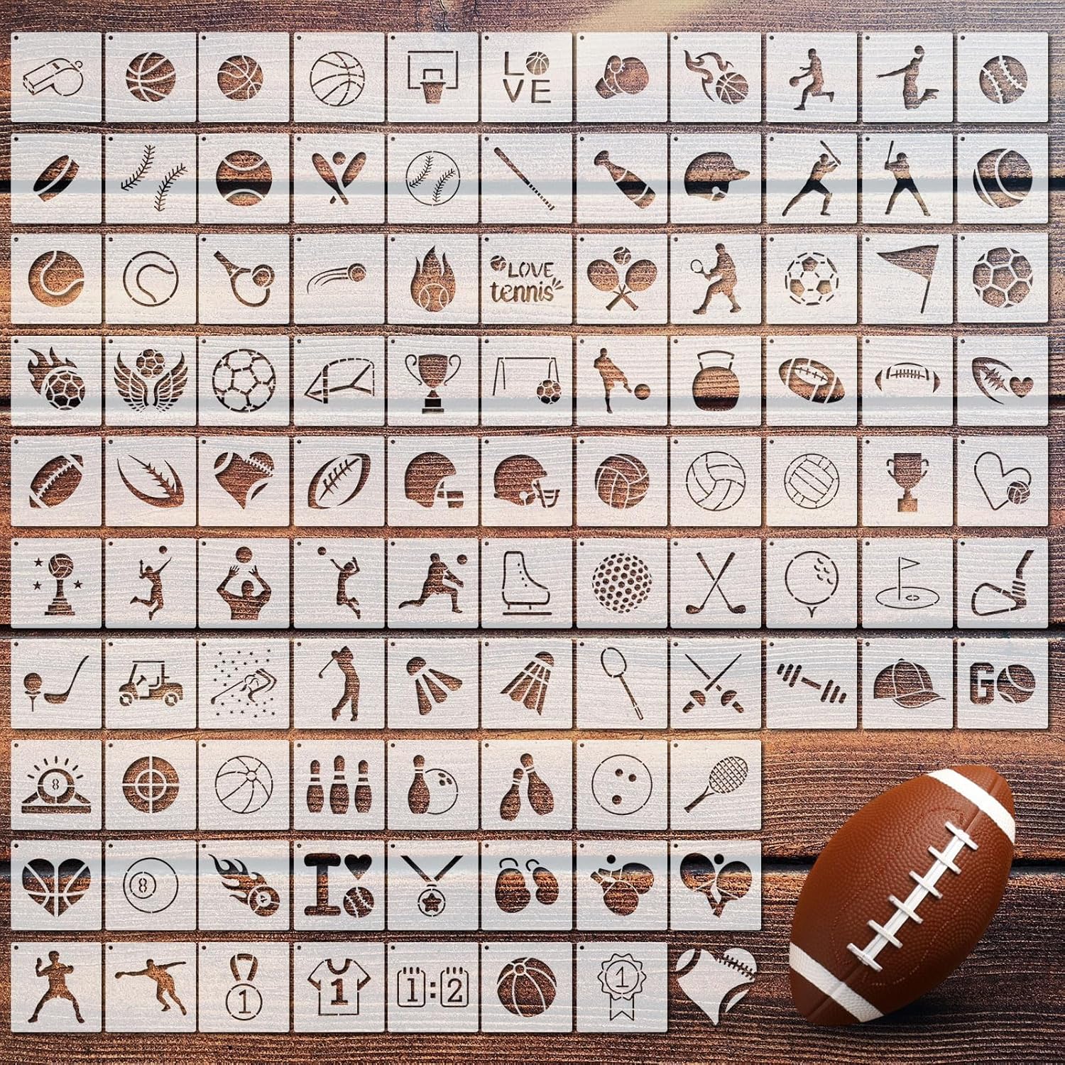 Fainne 100 Pcs Stencils for Painting on Wood Reusable Stencil Crafts Drawing Templates Holiday Wall Paper for DIY Scrapbook Home 2 x 2 Inch (Sport,Ball)