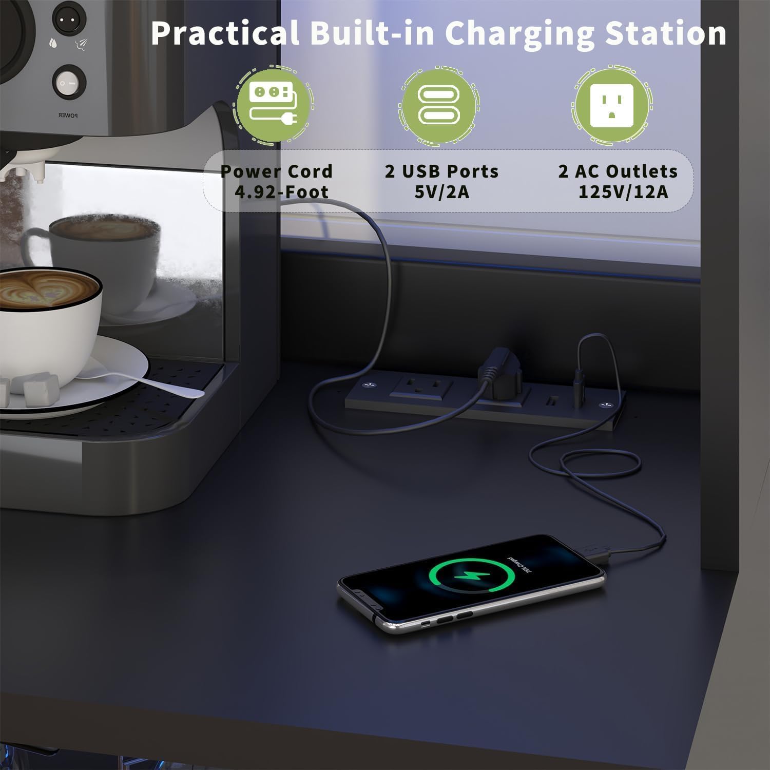 - Practical Charging Station: Our bar cabinet has been designed with all the appliances of modern life in mind and is equipped with 2 practical power outlets and 2 USB ports. Whether it's a coffee maker, juicer, toaster or your mobile phone and other electronic devices that are always close at hand, they can all be charged here. No need to worry about finding an extra power strip. With a 4.92-foot cable, it's easy to connect to power wherever you place your cabinet.