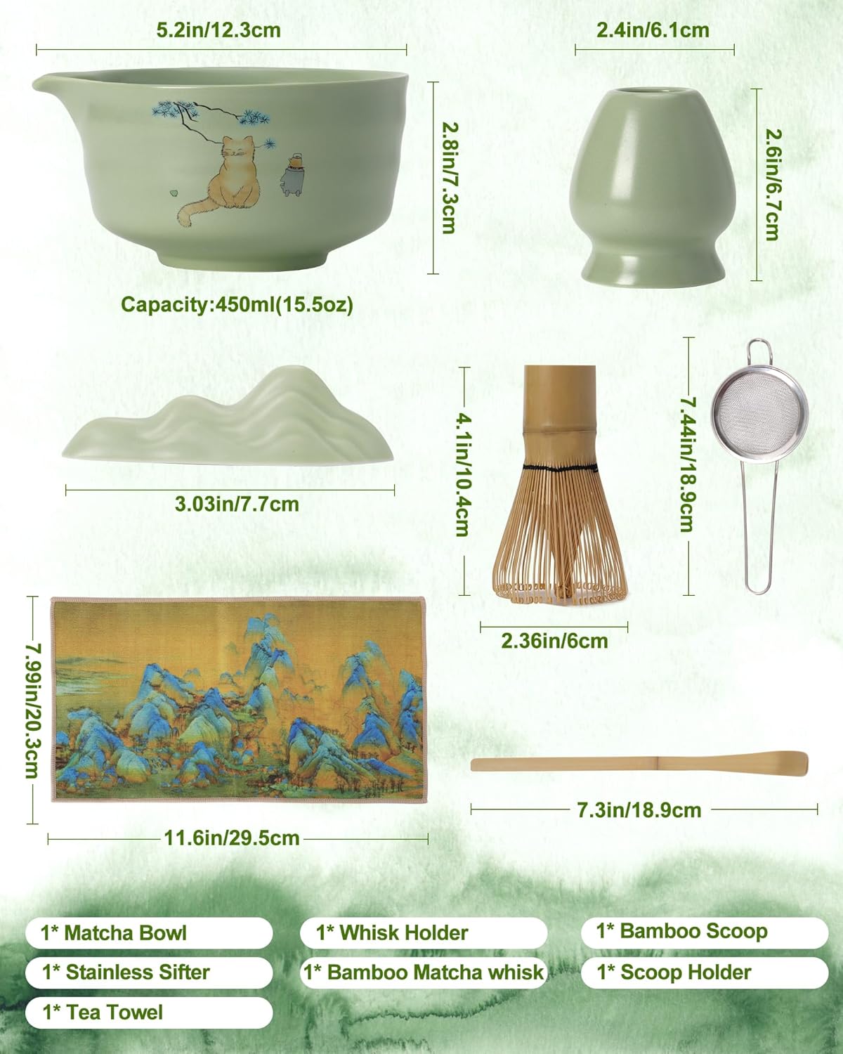 - 7-PCS MATCHA WHISK SET: 1*Ceramic Bowl whith Spout(chawan) 450 Ml/15.22 Oz, 1*Bamboo Whisk, 1*Bamboo Scoop (chashaku), 1*Cermaic Whisk Holder, 1*Ceramic Scoop Stand, 1*Cotton Tea Cloth (chakin), 1*Matcha Powder Sifter.Includes All Accessories.Elevate your tea ritual with our thoughtfully curated collection, perfect for both enthusiasts and newcomers to the world of matcha.