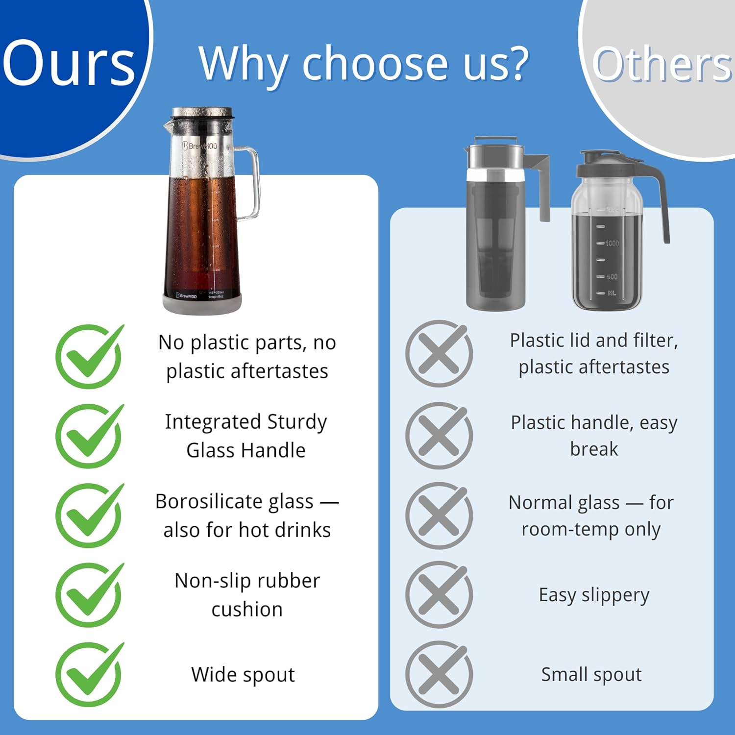 - [MORE THAN COFFEE – BREW TEA, TOO] Love iced tea? Loose leaves or tea bags work perfectly too! Steep cold overnight for crisp flavor, or brew hot—this pitcher does it all with borosilicate glass & filter. Elevate your hosting game with homemade cold brew or fruit-infused tea.