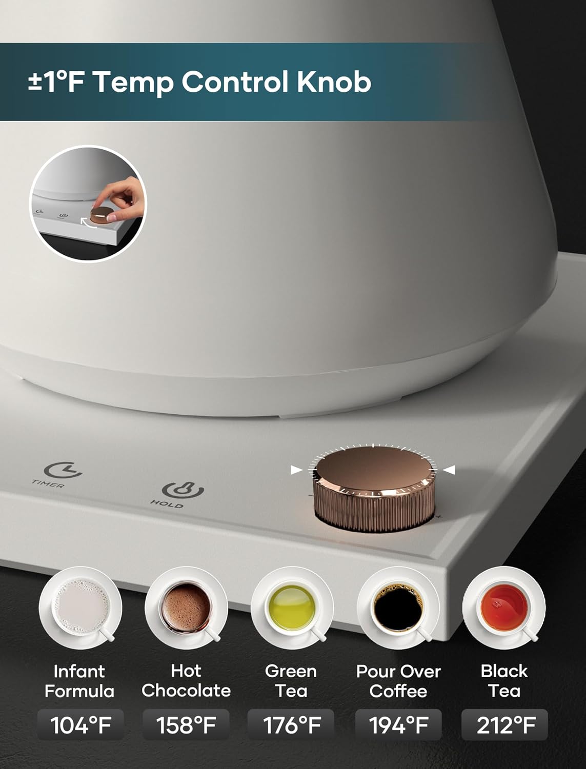 Electric Kettles, Gooseneck Electric Kettle, ±1℉ Temperature Control, Stainless Steel Inner, Quick Heating, for Pour Over Coffee, Brew Tea, Boil Hot Water, 0.9L White