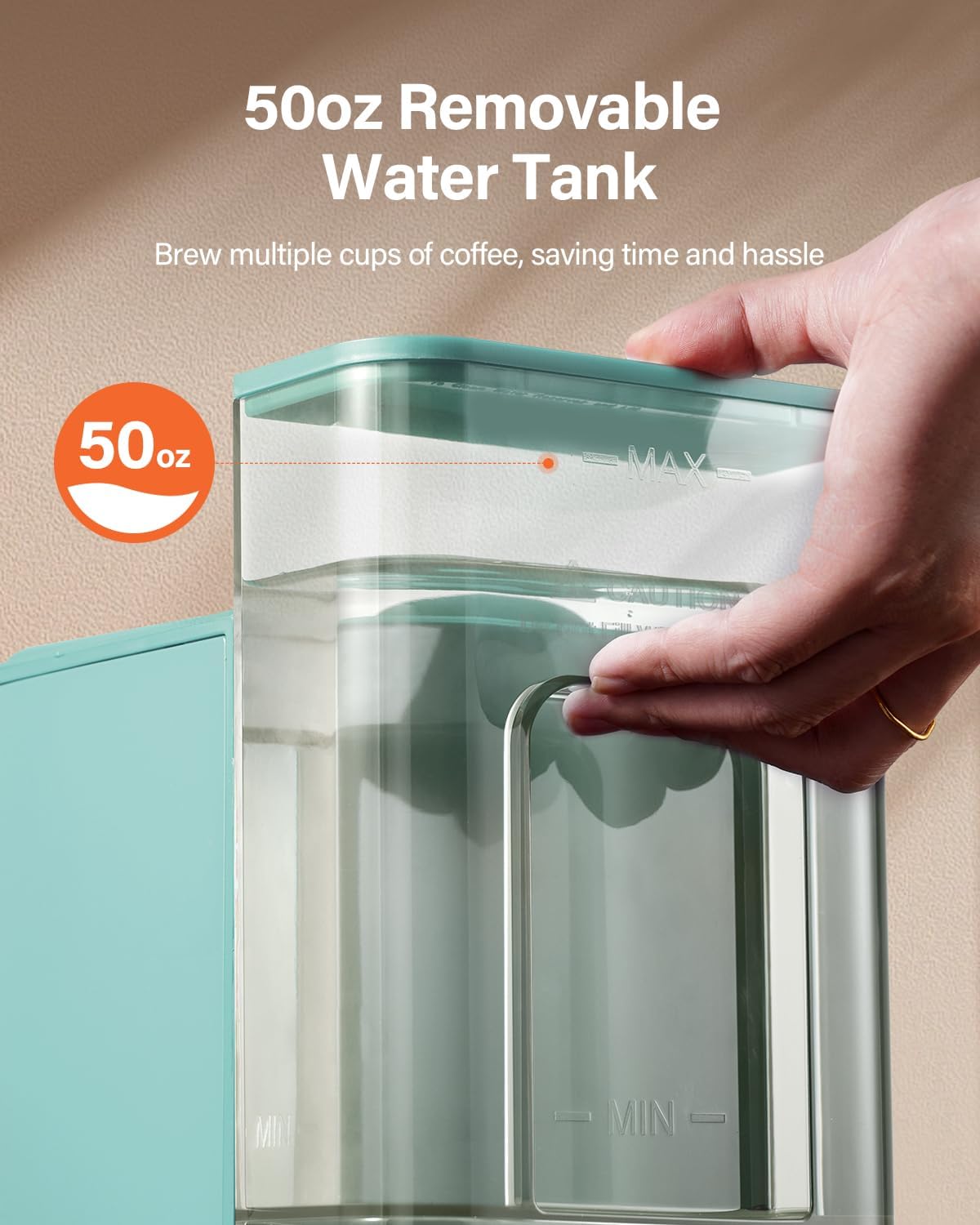 - 50 OZ REMOVABLE WATER TANK: The 50 oz large capacity enables brewing multiple cups of coffee at once, saving time and hassle; the fully visible water tank makes it easy to spot any impurities or build-up inside the tank for cleaning and maintenance