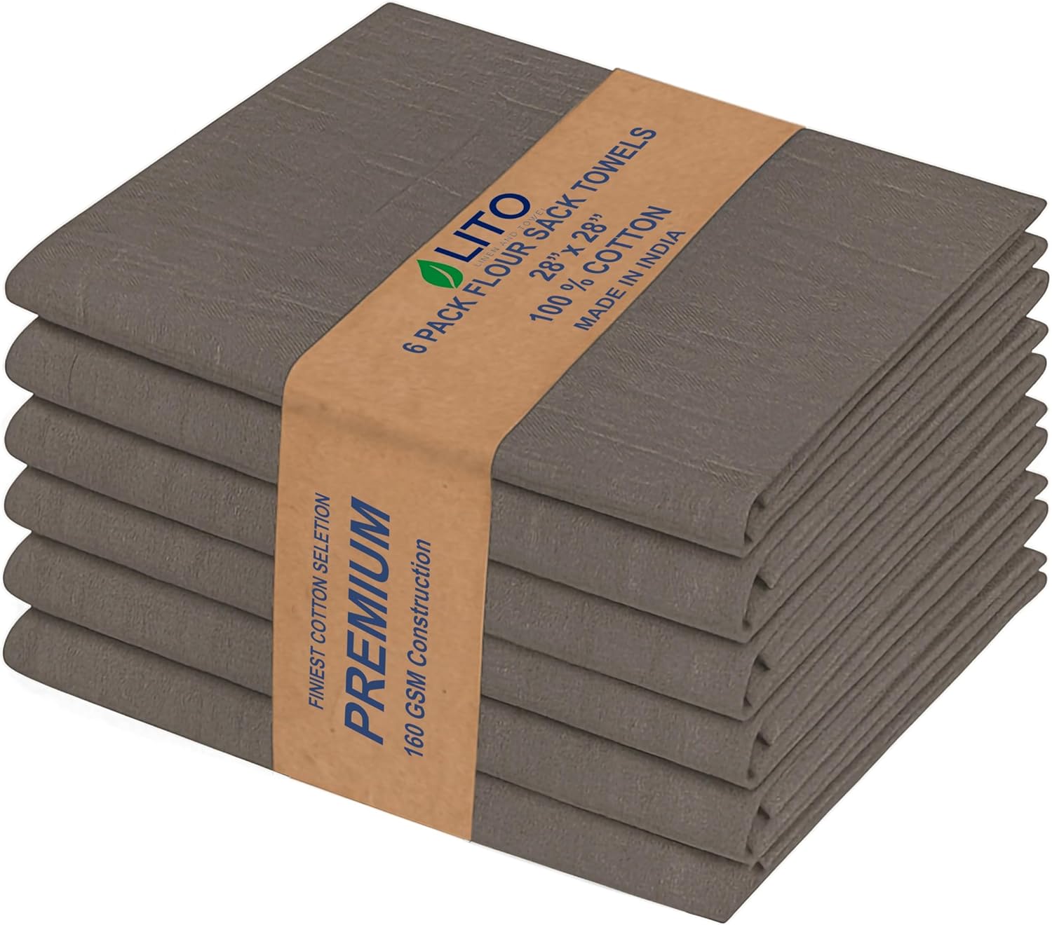 Flour Sack Dish Towels for Kitchen Set of 6 (28"x28") 100% Cotton Bread Dough Proofing Highly Absorbent Hand Towel, Thick Baking Cloth for Baguettes, Ciabatta, Pastry Reusable Tea Towels - Charcoal